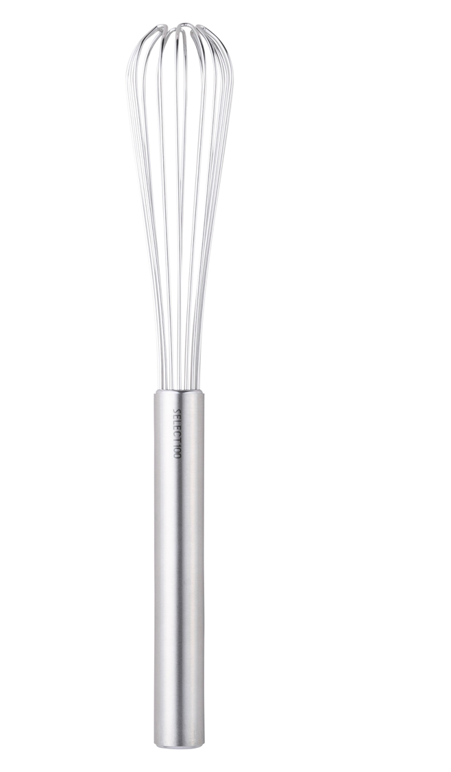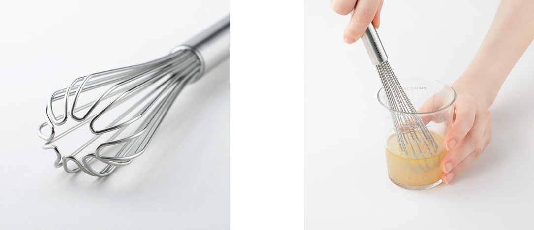 小さめのボウルや計量カップでも混ぜ合わせができる、スリムタイプのウィスク。茶せん形状によって、混ぜやすさと汚れのたまりにくさを両立しています。