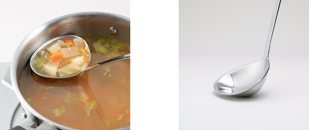 使いやすいサイズのレードル。フチ付きなので、液だれしにくく注ぎやすい形状になっています。ステンレス一体成形で洗いやすくなっており、レードルの先が鍋やフライパンのカーブにフィットするようやや平らになっているので、スープや具材を残すことなくすくえます。