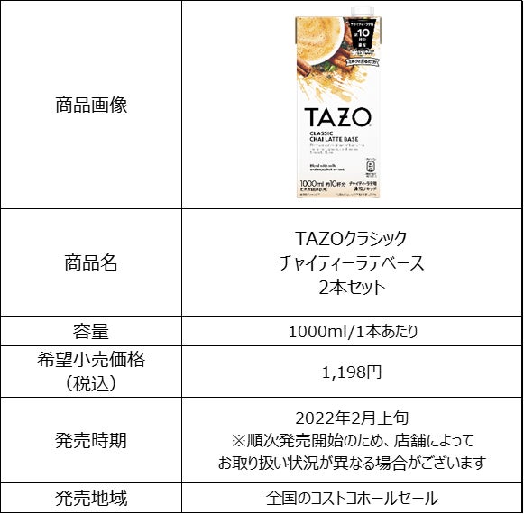 エカテラ・ジャパン・サービス株式会社(本社:東京都目黒区、ジェネラル・マネジャー:光宗 晃子、以下:エカテラ・ジャパン)は、アメリカで人気のティーブランド「TAZO」から、誰でも簡単にチャイティーラテが作れる濃縮リキッド「TAZOクラシックチャイティーラテベース」を発売いたします。2022年春の本格展開に先駆け、2022年2月上旬より、全国のコストコホールセールにて、2本セットの数量限定で順次発売を開始します。