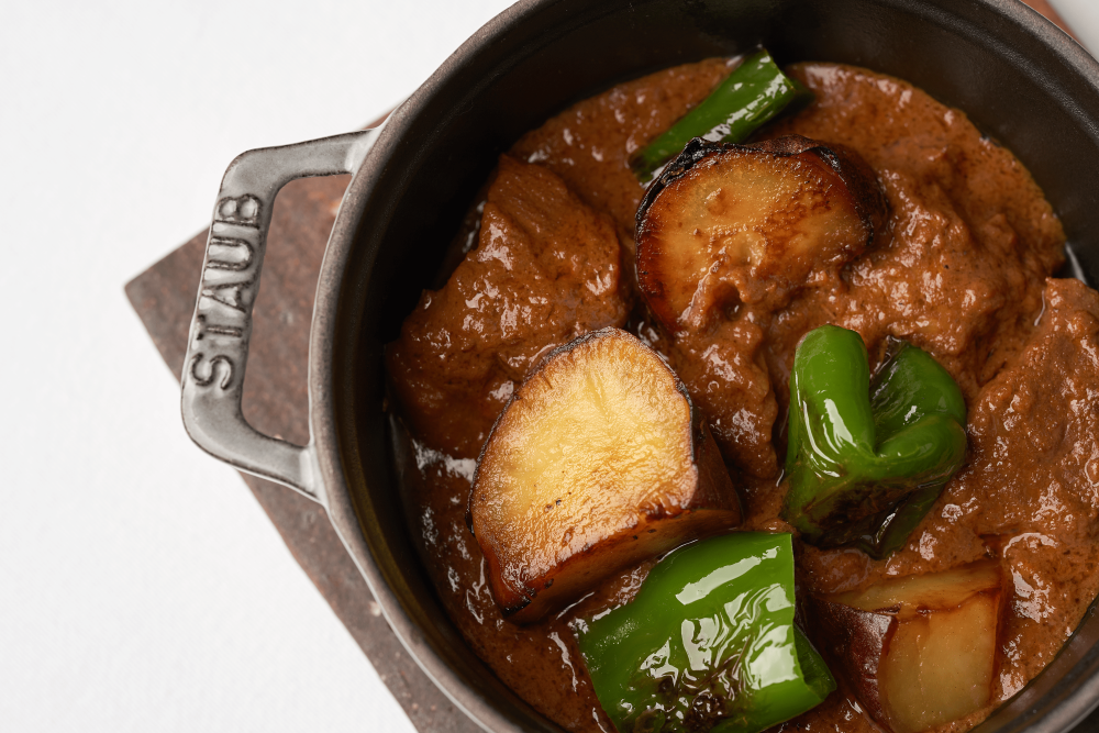 茨城県の新しい銘柄豚「常陸の輝き」はさっぱりとした脂のキレが良く、おいしい豚肉です。茨城県は全国でも指折りの野菜の産地ですが、私が生まれ育った鹿行(ろっこう)地区で生産が盛んな「ピーマン」「さつまいも」など、豚肉の旨味と相性の良い野菜の滋味も楽しんでいただけるカレーです。