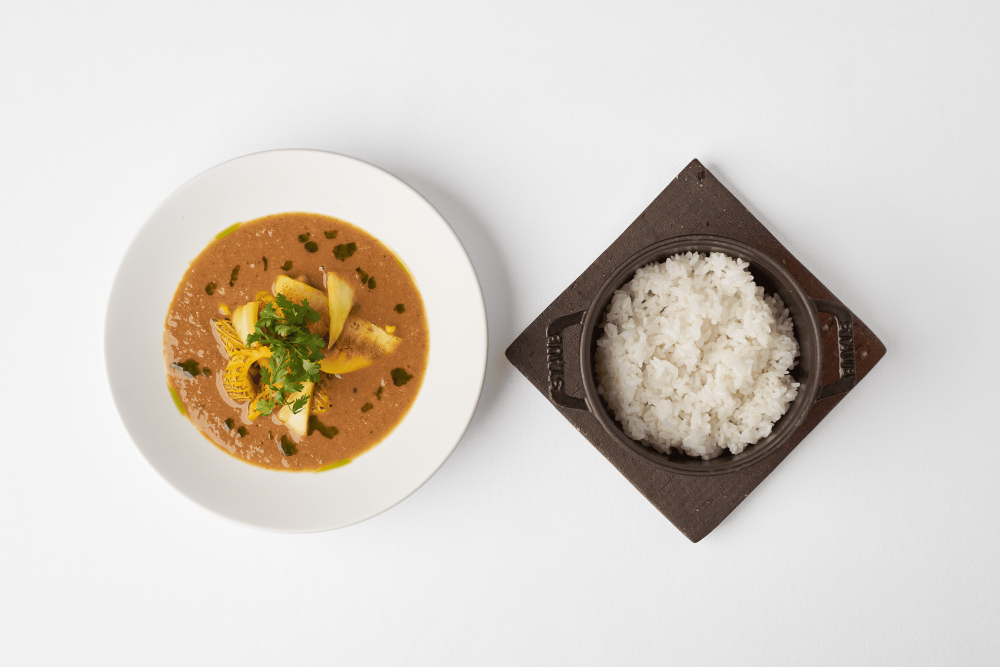 シェフ萩原のオリジナルカレーは、冬から春にかけてが旬の「ヤリイカ」を丸ごと使用した、『常磐沖ヤリイカと白菜のスープカレー サフラン風味』です。ヤリイカの肝とゲソ、白菜から旨味を引き出し、オリジナルスパイスと共にスープカレーに仕立てます。この時期のヤリイカは肉厚で上品な甘みが特徴で、甘みはスルメイカの30倍。思い切ってカレーの主役に抜擢しました。白菜の茎の部分はサフランと貝のブイヨンでマリネします。ガルニチュールとしてお楽しみください。食材王国いばらきの冬の魅力をご賞味ください。