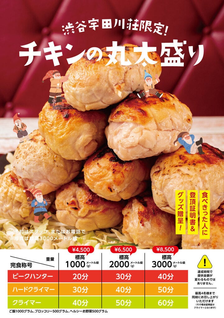 この「丸太のログチキンステーキ」を組み上げたメガ盛りメニュー「チキンの丸太盛り」が渋谷宇田川店限定で登場します。標高3000メートル級、2000メートル級、1000メートル級が選べ、それぞれログチキンの量は3000グラム、2000グラム、1000グラム。いずれも、バーリーライス1000グラム、ブロッコリー500グラム、ヘルシーお野菜500グラムがセットで付いており、最高で総重量5000グラムに及びます。完食された方には、タイムに応じた称号付きの登頂証明書とオリジナルグッズ“登頂成功タオル”をプレゼントいたします。
