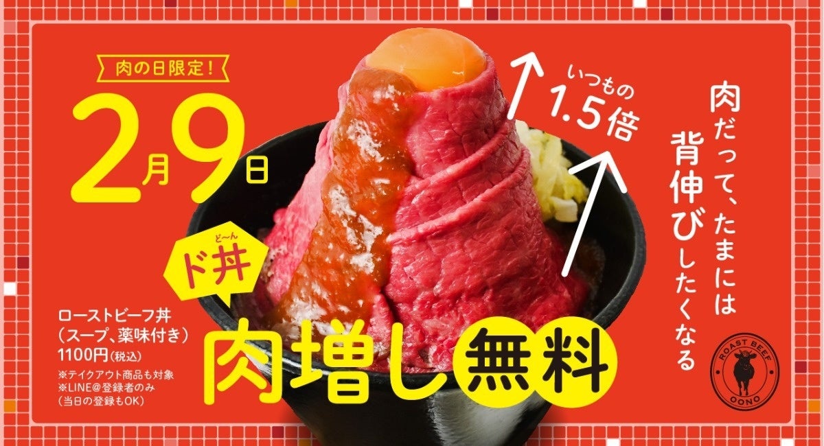 1年に1度だけの「肉の日」。『ローストビーフ大野』では、2月9日(水)だけのお楽しみとして、「ローストビーフ丼」の肉量を通常の1.5倍に増量いたします。スープと薬味付きで、通常価格の1,100円。いつもの価格で、ローストビーフ丼が背伸びしてお待ちしております。