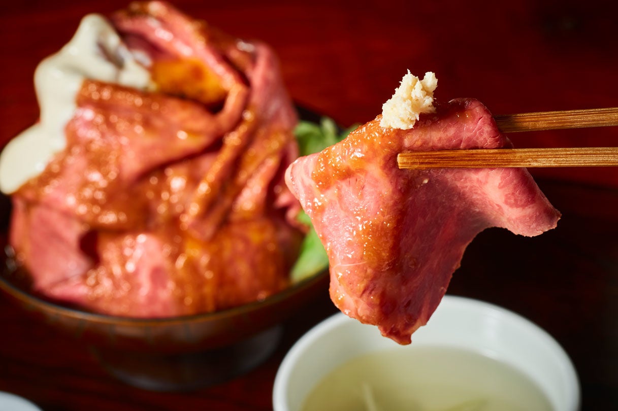 訪れる人の多くが写真に収める「ローストビーフ丼」は、まさに「ご褒美ご飯」といったビジュアル。大きくスライスされたローストビーフは、低温で7時間じっくりと加熱し、ホロリととろける柔らか食感に仕上げています。ひと口頬張ると、口中に旨みたっぷりの肉汁が広がります。