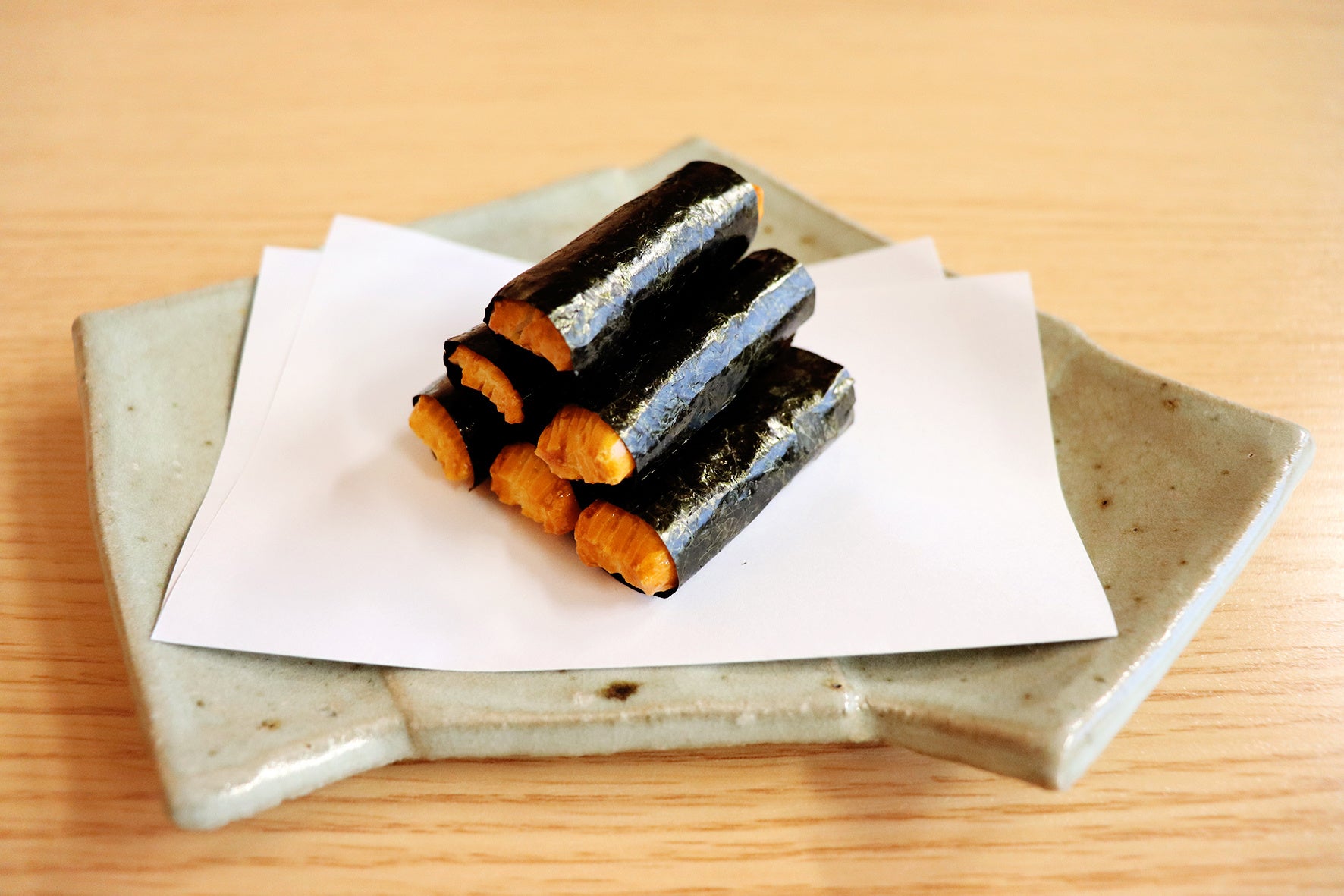 海苔は有明産焼き海苔使用、高知県産柚子から抽出した果汁パウダーを使用することで、爽やかな柚子の香りと香ばしい焼き海苔を感じられる醤油あられとなりました。ゆず海苔巻は噛めば噛むほど、柚子の香りと酸味をお楽しみいただけるあられです。