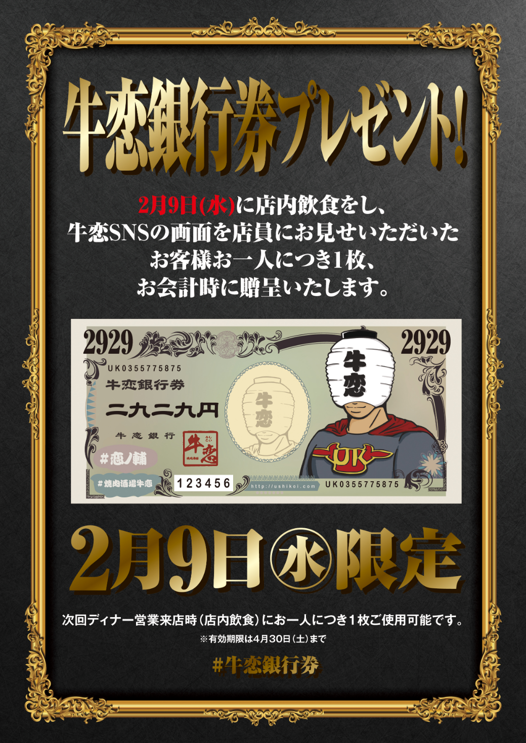 こんなご時世でも、牛恋を応援して下さる皆様への感謝をこめて、今回”牛恋銀行券”の配布を決定しました。スタッフには止められたが、最低注文金額なしで2,929円奢っちゃうことに。ここまでやったからにはもう、後戻りはできない。赤字ついでだ…。どうぞ皆さま、好きなだけタダで牛恋「タダ恋」しちゃって下さいな。