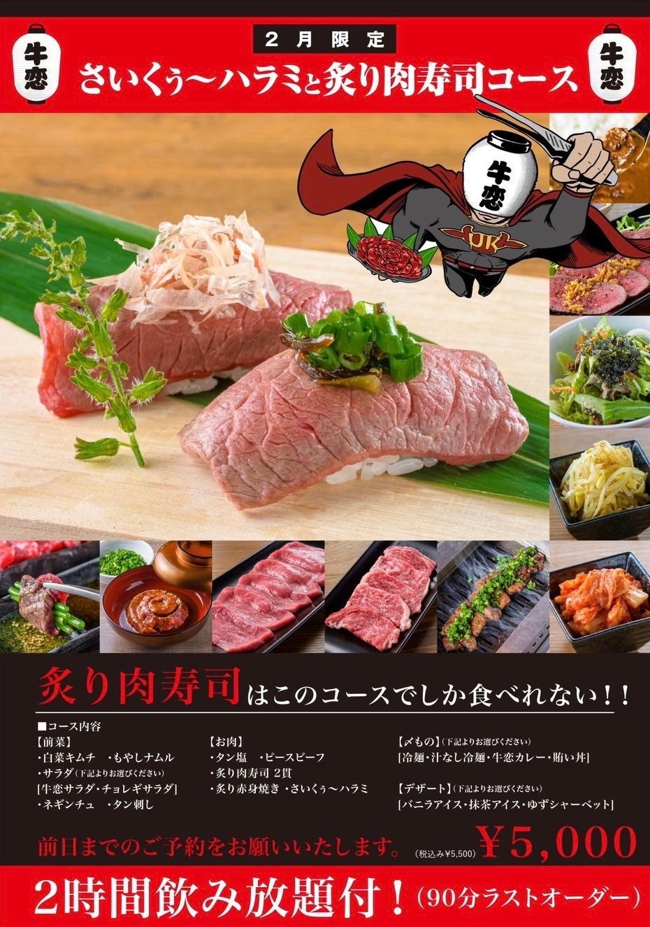 2月限定の「さいくぅ~ハラミと炙り肉寿司コース(5,000円 税別)」は、通常メニューにはない人気の【炙り肉寿司】が食べられる、焼肉ファンに捧げる1カ月のみのスペシャルコース。