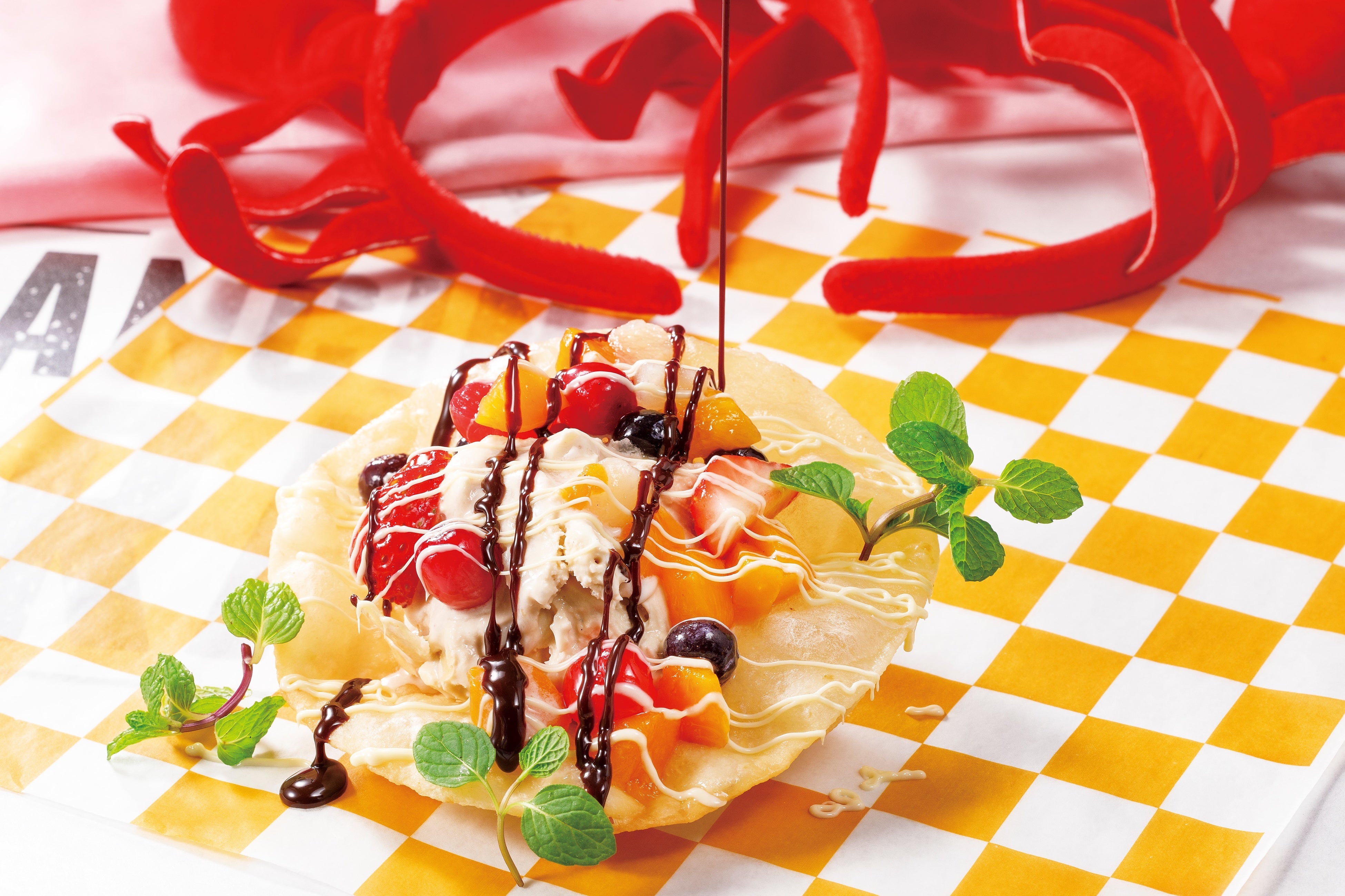 ティラミス味のアイスを揚げたトルティーヤにのせ、お客様の目の前でフルーツポンチやフレッシュフルーツをトッピングし、仕上げにブラック&ホワイトのチョコレートソースをかけるライブデザート。トルティーヤのサクッと感や、ティラミスアイスのなめらかさ、アイスの上で固まったチョコレートソースのパリパリ感など、いろいろな食感を楽しめ、アイスやフルーツ、チョコレートの甘さと、トルティーヤのほんのり塩味のバランスが絶妙。