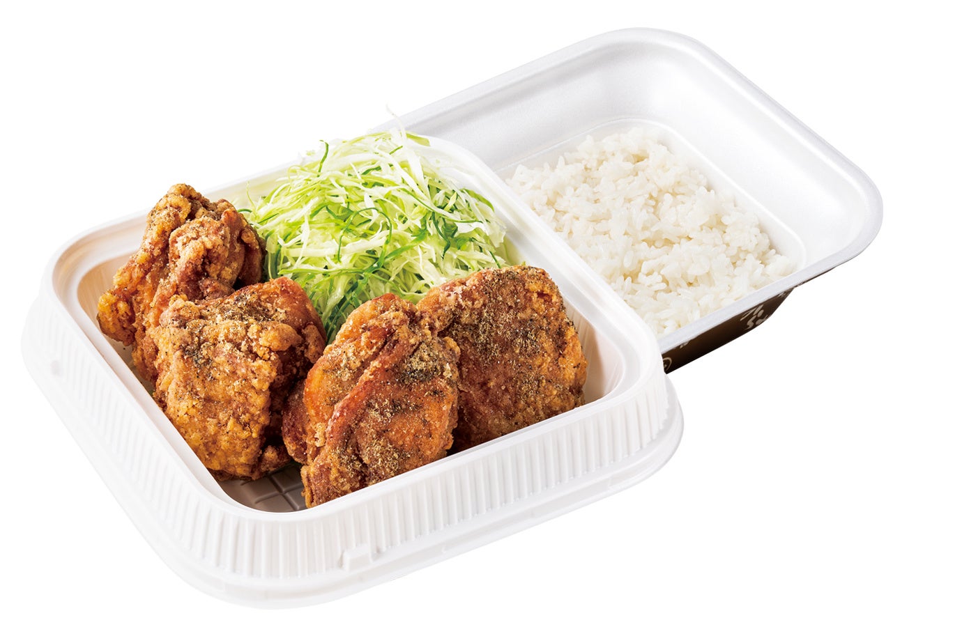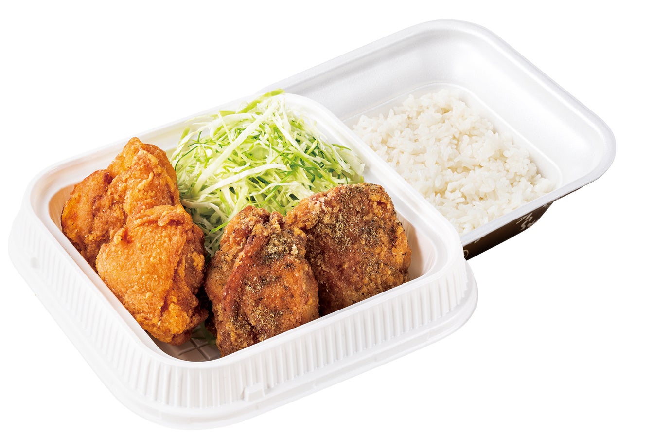 (出汁からあげ2個、カリッともも2個、千切りキャベツ、ご飯)