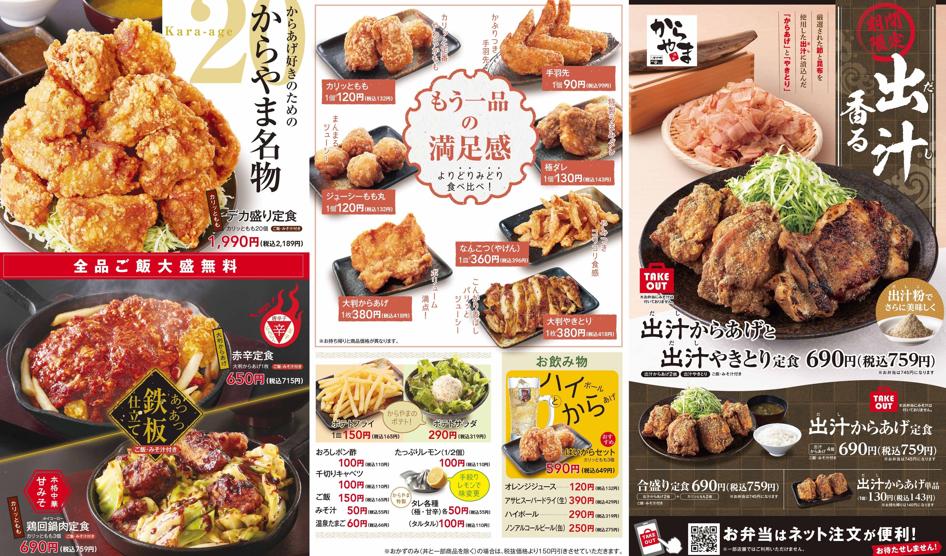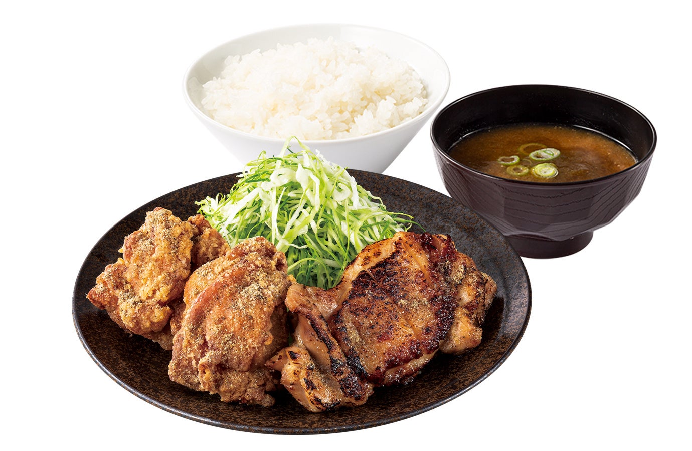 2019年2月に期間限定で販売し、2019年の期間限定メニュー人気ランキングで第1位の「出汁からあげ」が、出汁やきとりと合盛りの1度で2度おいしい定食として装い新たに「からやま」で販売を開始いたします。