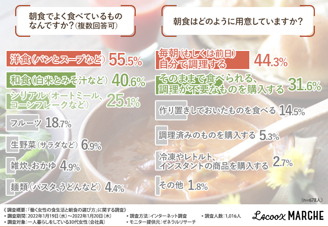 そこで今回、忙しい日々にも美味しくて栄養満点な食事をお届けする『LACOOK MARCHE(ラコックマルシェ)』(https://lacookmarche.com/shop)を運営する株式会社オモヤは、一人暮らしをしている30代女性を対象に、「働く女性の食生活と朝食の選び方」についての調査を実施しました。