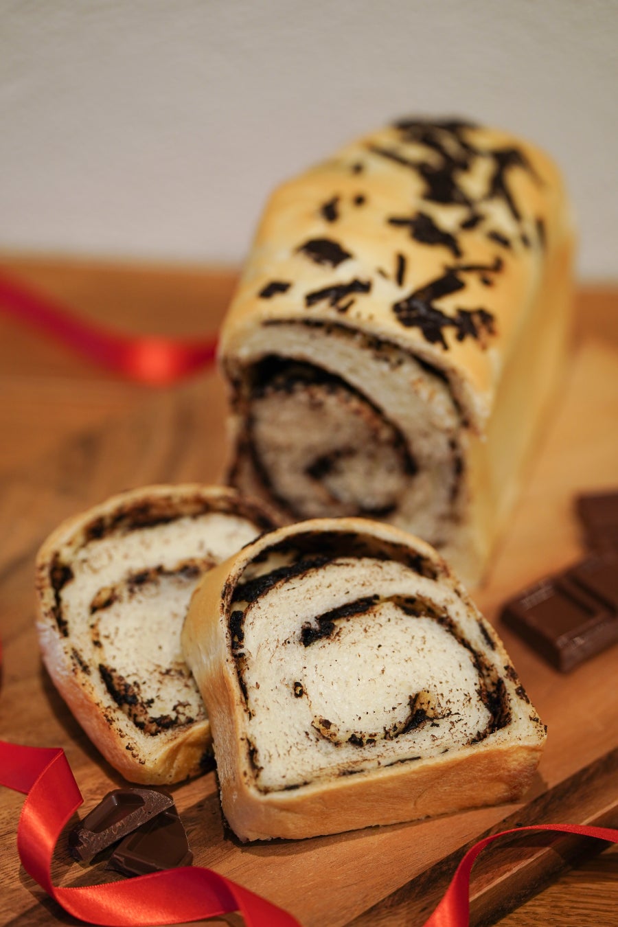 しっとりとしたふわもち食感が特徴のミルク食パンの生地に、コクと風味豊かなカカオ香るベルギーチョコレートをたっぷりと使用したチョコレート好きにはたまらないマーブルチョコ食パン。