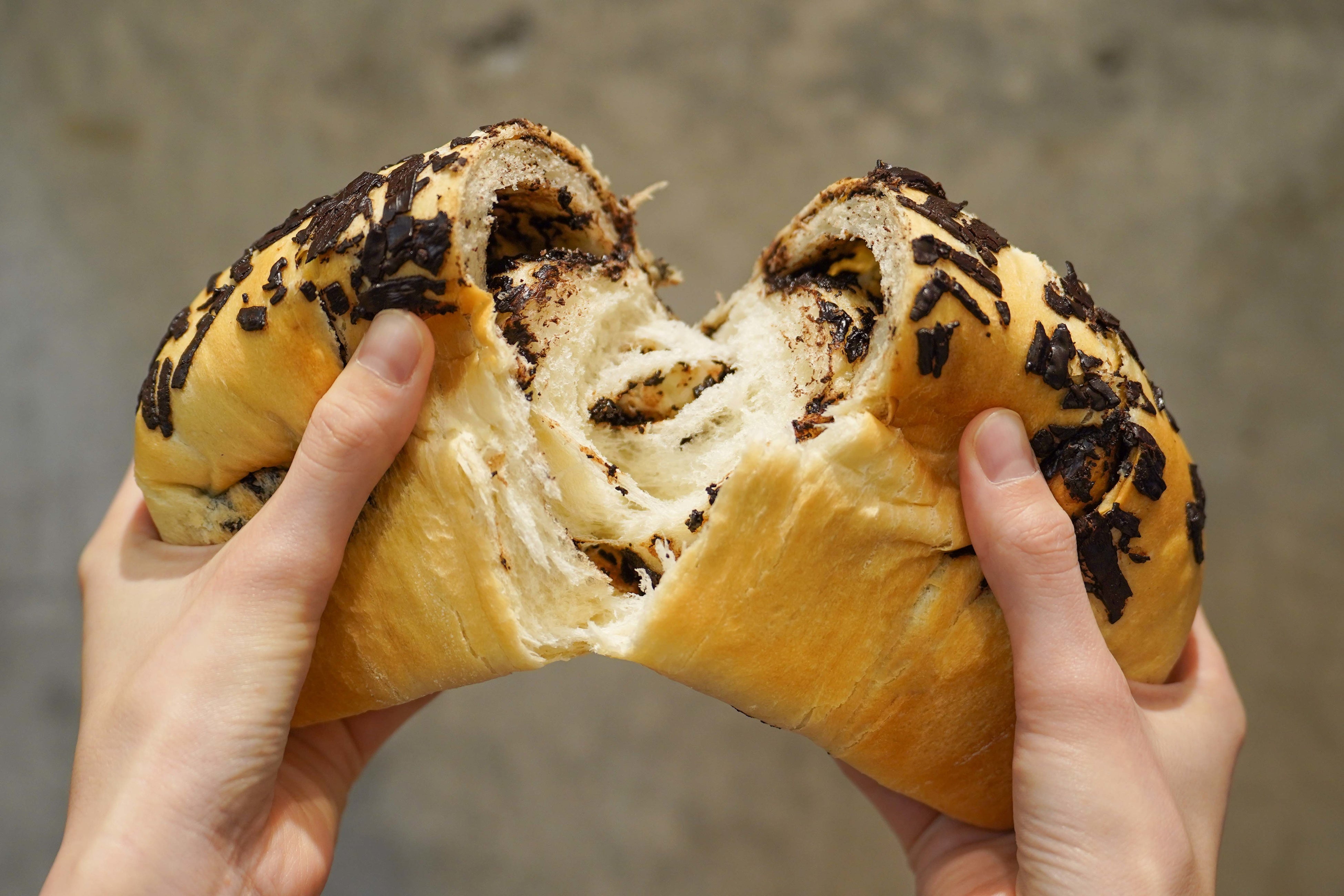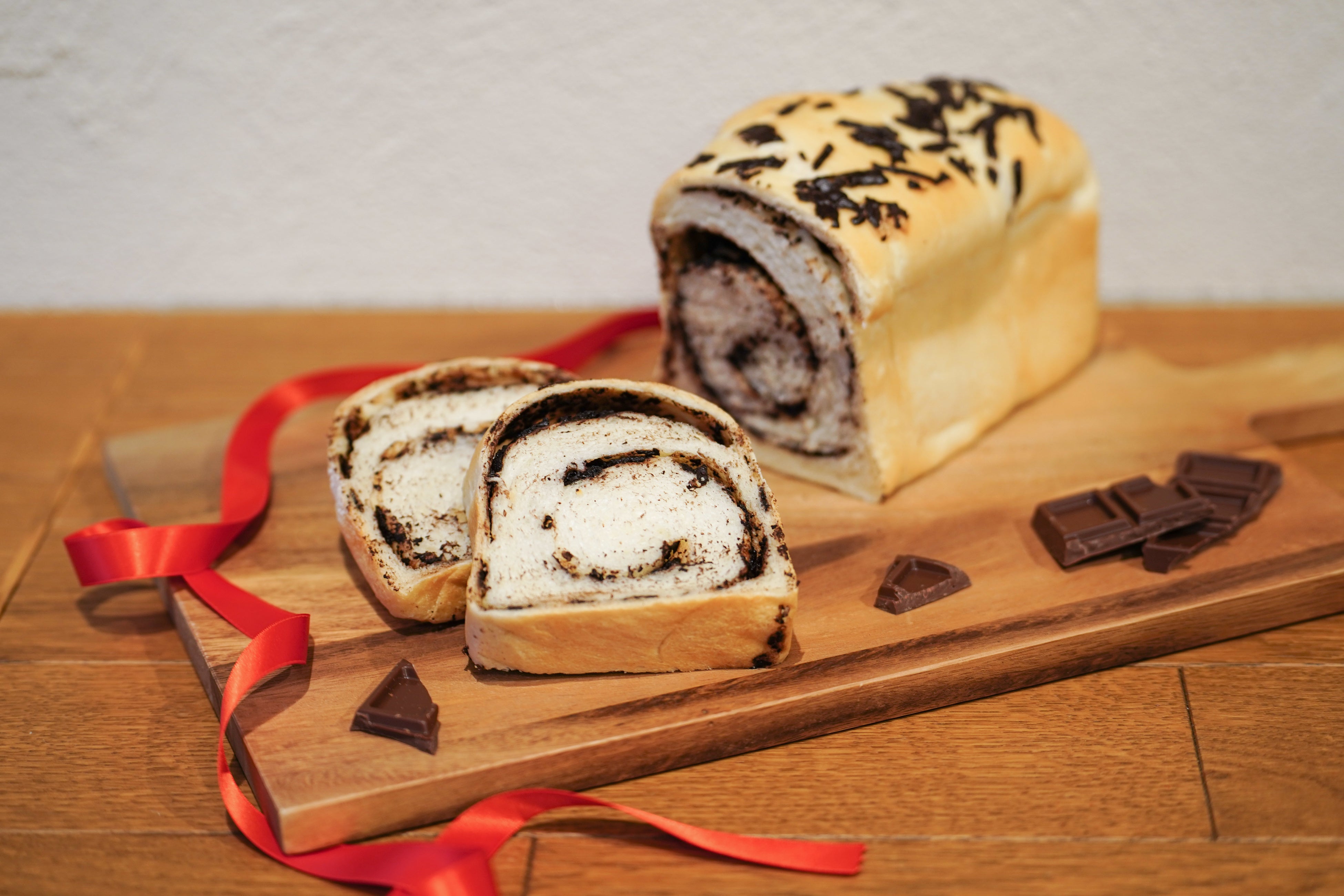 しっとりとしたふわもち食感が特徴のミルク食パンの生地に、コクと風味豊かなカカオ香るベルギーチョコレートをたっぷりと使用したチョコレート好きにはたまらないマーブルチョコ食パン。