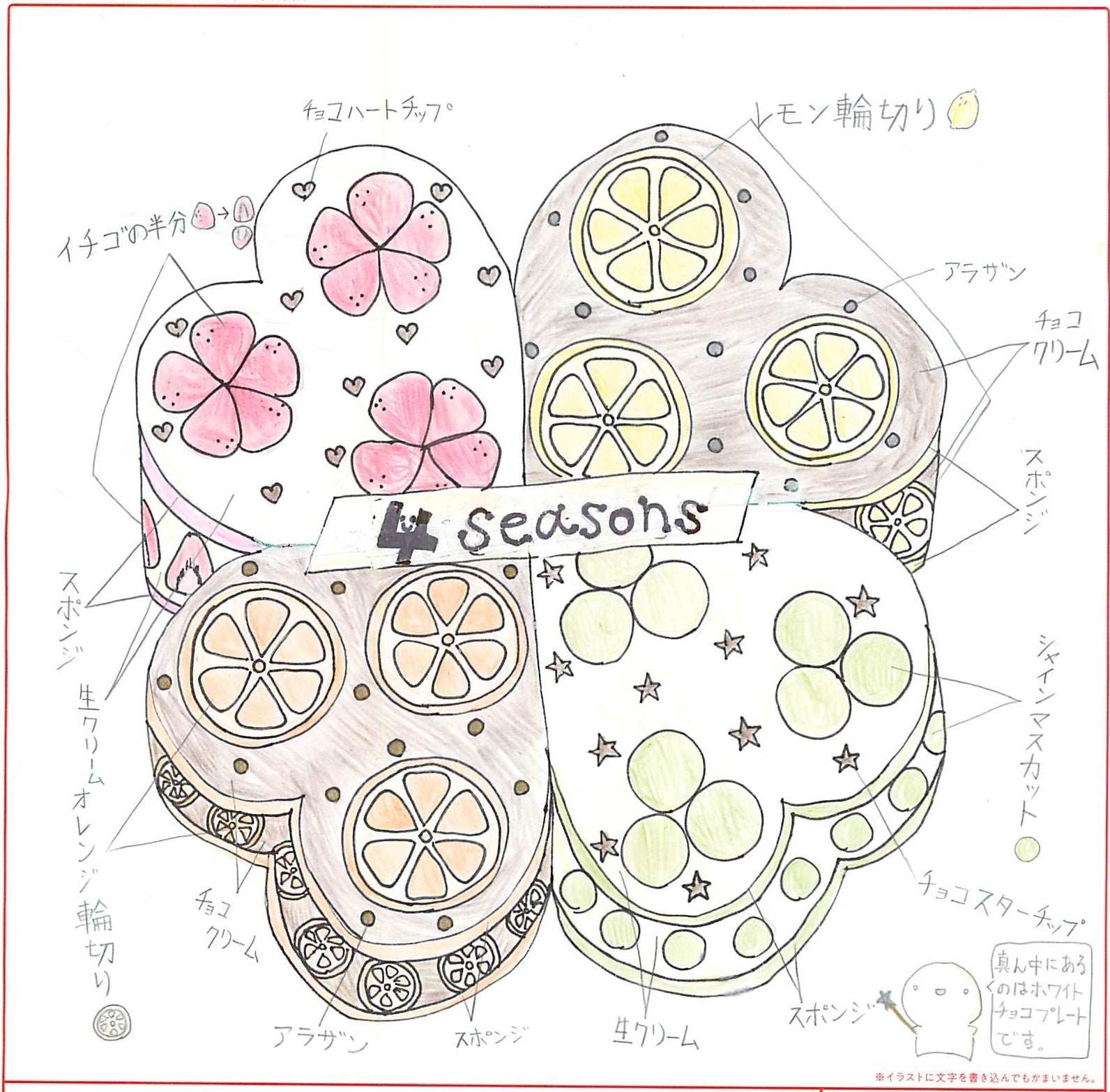 左上から春、右上が夏、右下が秋、左下が冬をイメージしました。イチゴを5つ並べてお花にしました。ハートのケーキを4つ並べて四葉のクローバー。