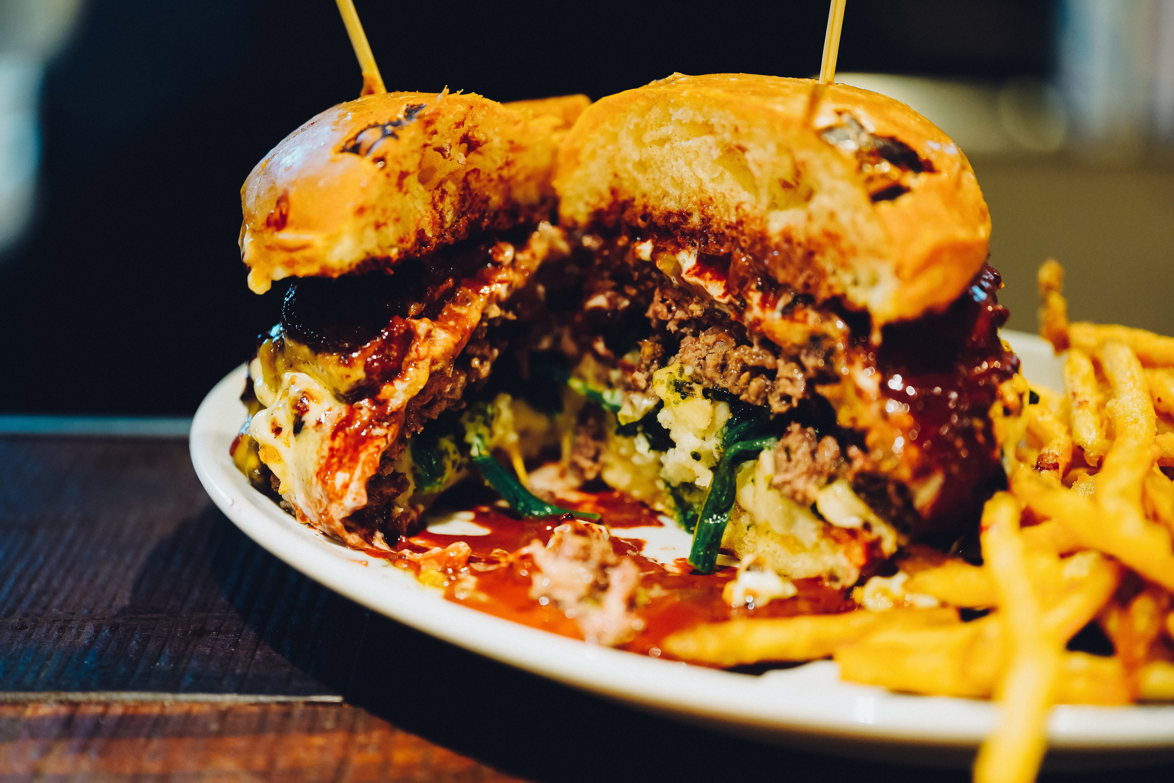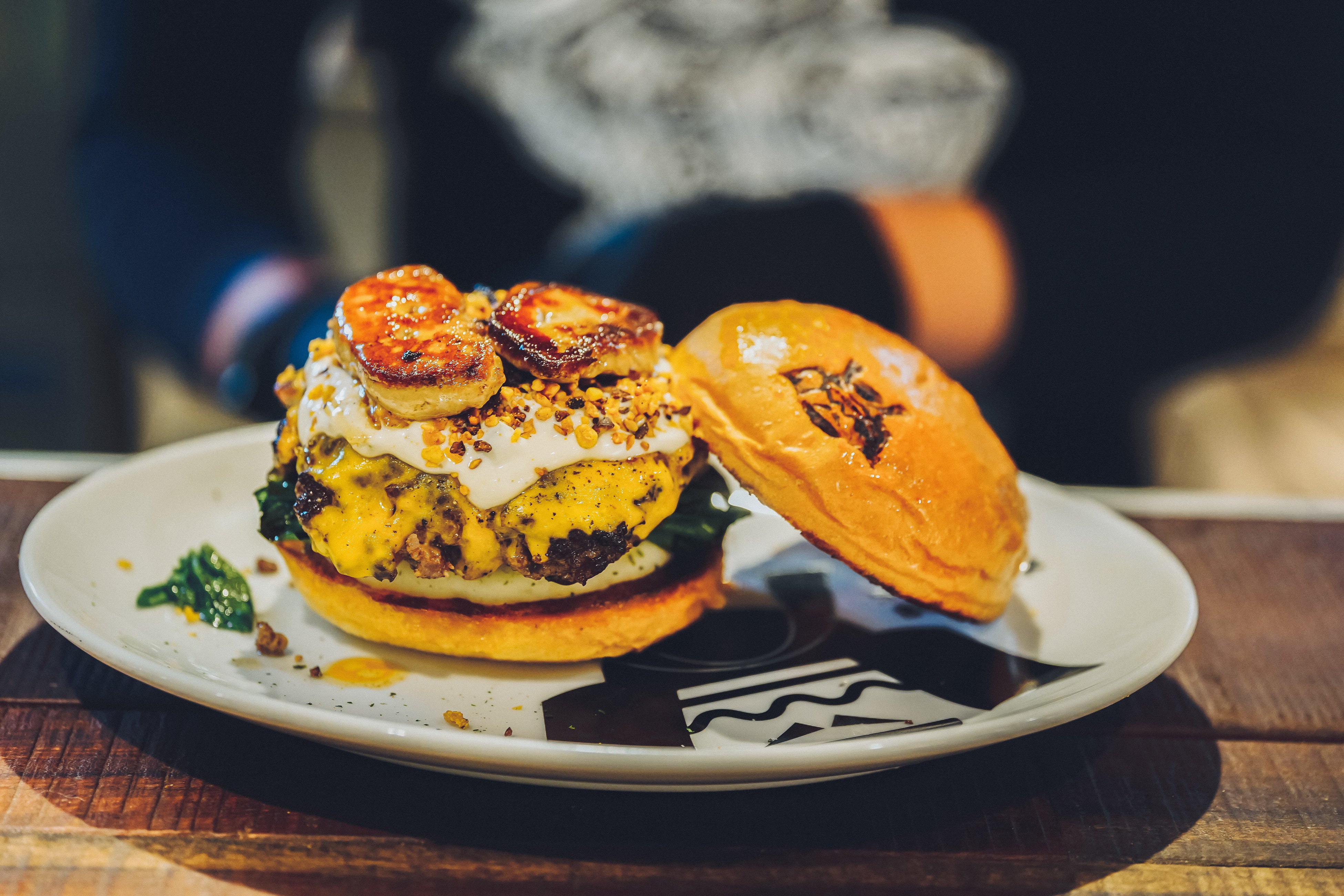 サンドされているのは、和牛パテ、フォアグラ、焼きほうれん草、マッシュポテト、瞬間燻製ゴーダチーズ。
