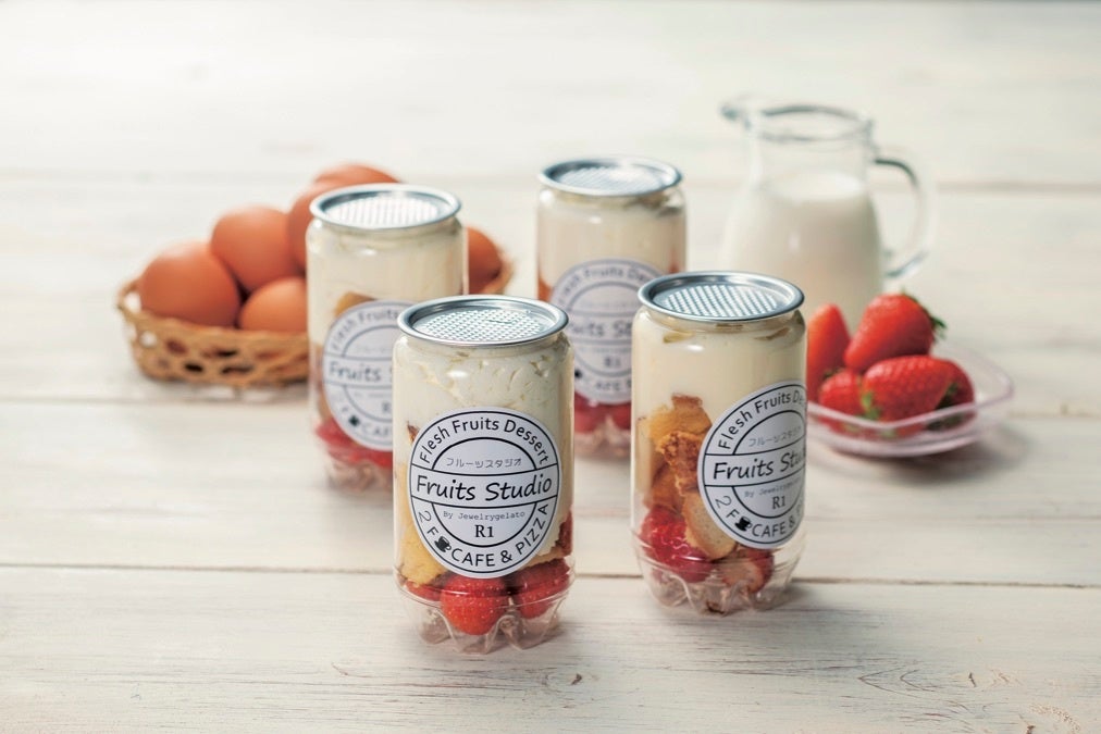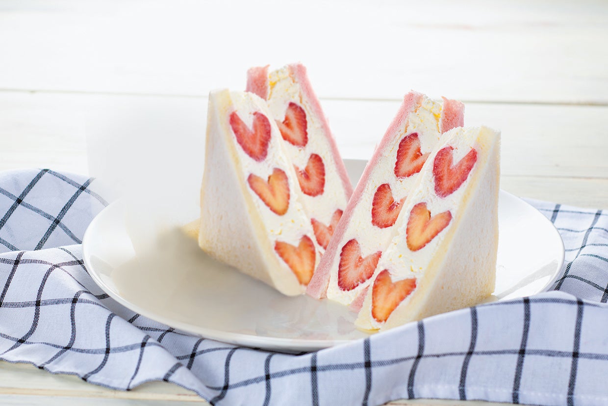 クリアなプラスチック缶の中に入ったフレンチトーストと、見た目鮮やかなフルーツサンド。