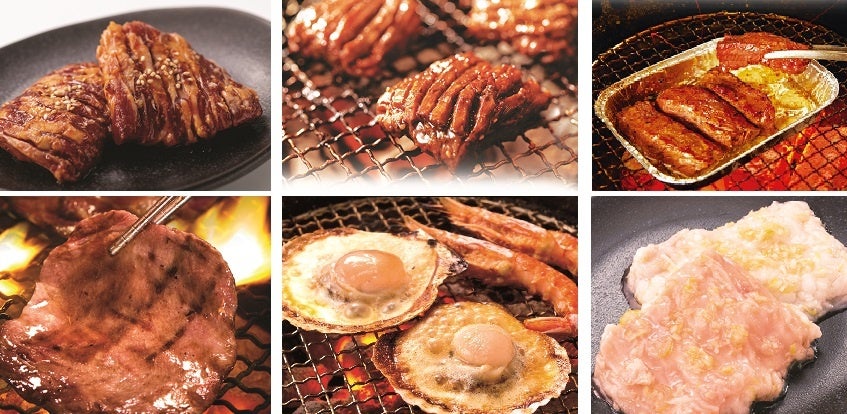 「牛角コース」は熟成厚切りカルビや王様ハラミ、熟成上ロースステーキなど90品、「堪能コース」は牛タン塩や上ホルモン、殻付きホタテや冷麺までなどの100品をお召し上がりいただけます。