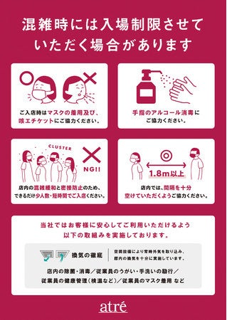 アトレでは、お客様ならびに従業員の健康と安全に配慮し、新型コロナウイルス感染防止対策として以下の取組みを実施しております。