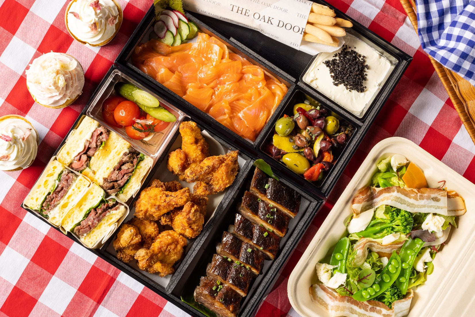 厳選した素材をダイナミックに調理するステーキハウス「オーク ドア」では、暖かな春の陽気の中、思わずピクニックに出かけたくなるようなテイクアウトセットが登場いたします。オーク ドアの料理人たちが、もし実際にピクニックに持って行くことを想定し作った、食べやすく、シェアもしやすいテイクアウトセットです。スティック状でスナック感覚で食べやすいグリッシーニのディップは、トリュフやゴートチーズをつかったマッシュポテト、桜チップでスモークした香ばしい自家製スモークサーモン、弱火でじっくり火入れをし柔らかくなったステーキを挟んだサンドイッチなど、中身もラグジュアリーです。サラダからビーフサンドイッチ、デザートまで入り、ピクニック気分が盛り上がます。オンライン注文で事前決済が可能なので、お受け取りもスムーズです。ステーキハウスのシェフ渾身のお料理を囲む、春のピク“肉”(ピクニック)をご自宅や公園などで、お好きな場所でお楽しみください。