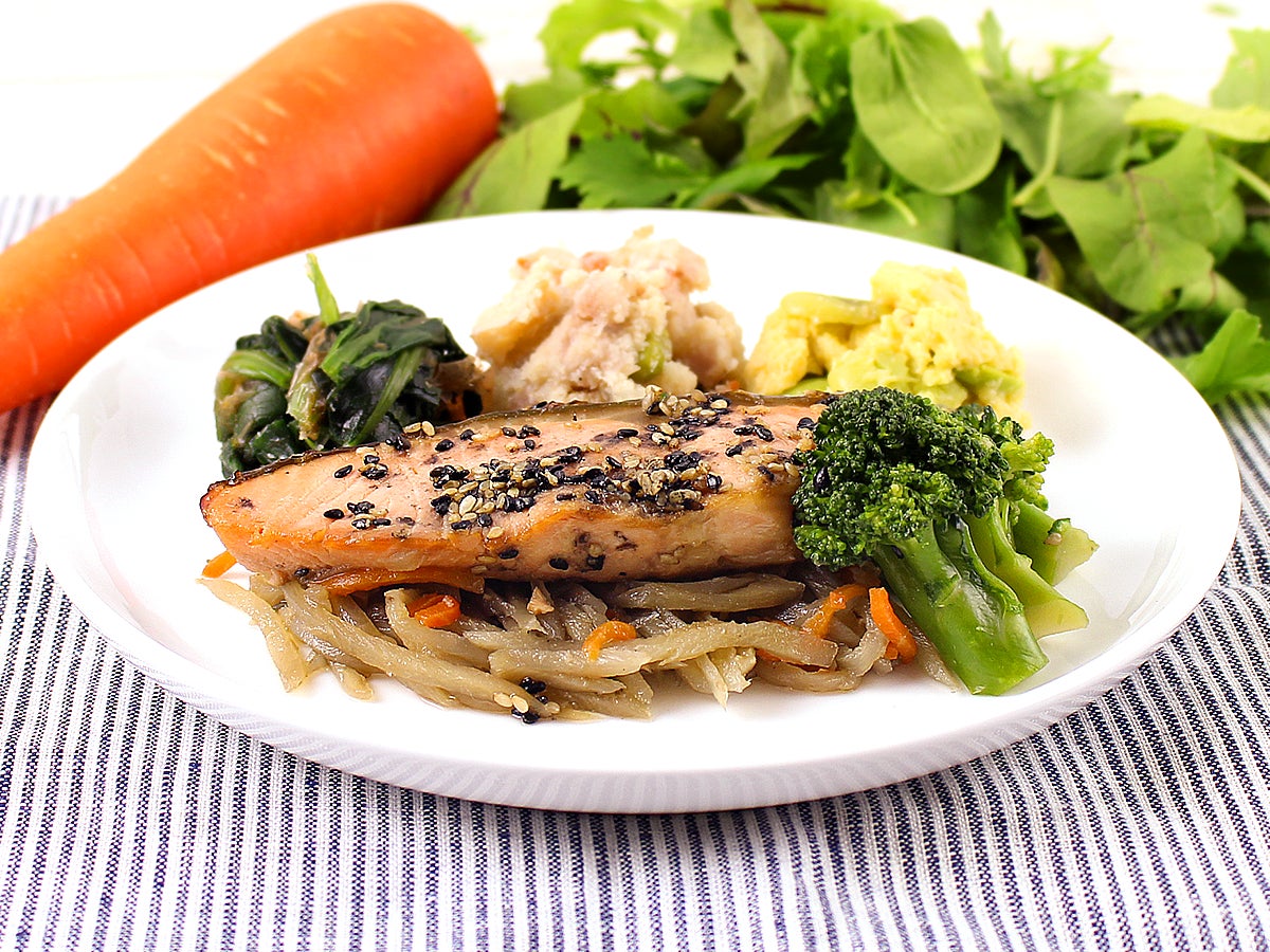 ロングセラーの鮭料理プレートをリニューアルしました。シンプルな塩味とごまの香ばしさが感じられる素朴な一品です。黒ごまと白ごまの2種類を使用して、ごまの風味がより強くなるようにしました。優しい味のきんぴらごぼうを鮭の下に敷き、食べやすく飽きのない味に仕上げております。副菜は、小松菜のおひたし、卯の花、そら豆と炒り卵です。全体的にあっさりとした味わいのセットですので、朝食にご利用いただくのもオススメです。