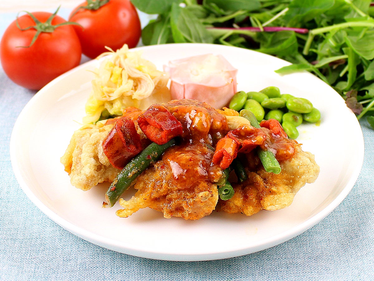 鶏モモ肉のから揚げを、唐辛子とカシューナッツを合わせた辛味ソースでガツンと濃いめの味で仕上げました。麻辣醤と山椒たれを合わせた刺激的な辛さになっております。唐辛子も食べられますのでパリパリ食感をお楽しみください。副菜は、白菜と鶏肉の葱生姜だれ、海老と白身魚をきれいな桜色の皮で包んださくら焼売、枝豆と搾菜のあえものです。辛い主菜に合わせてあっさりめで揃えております。