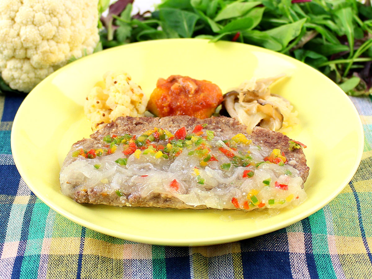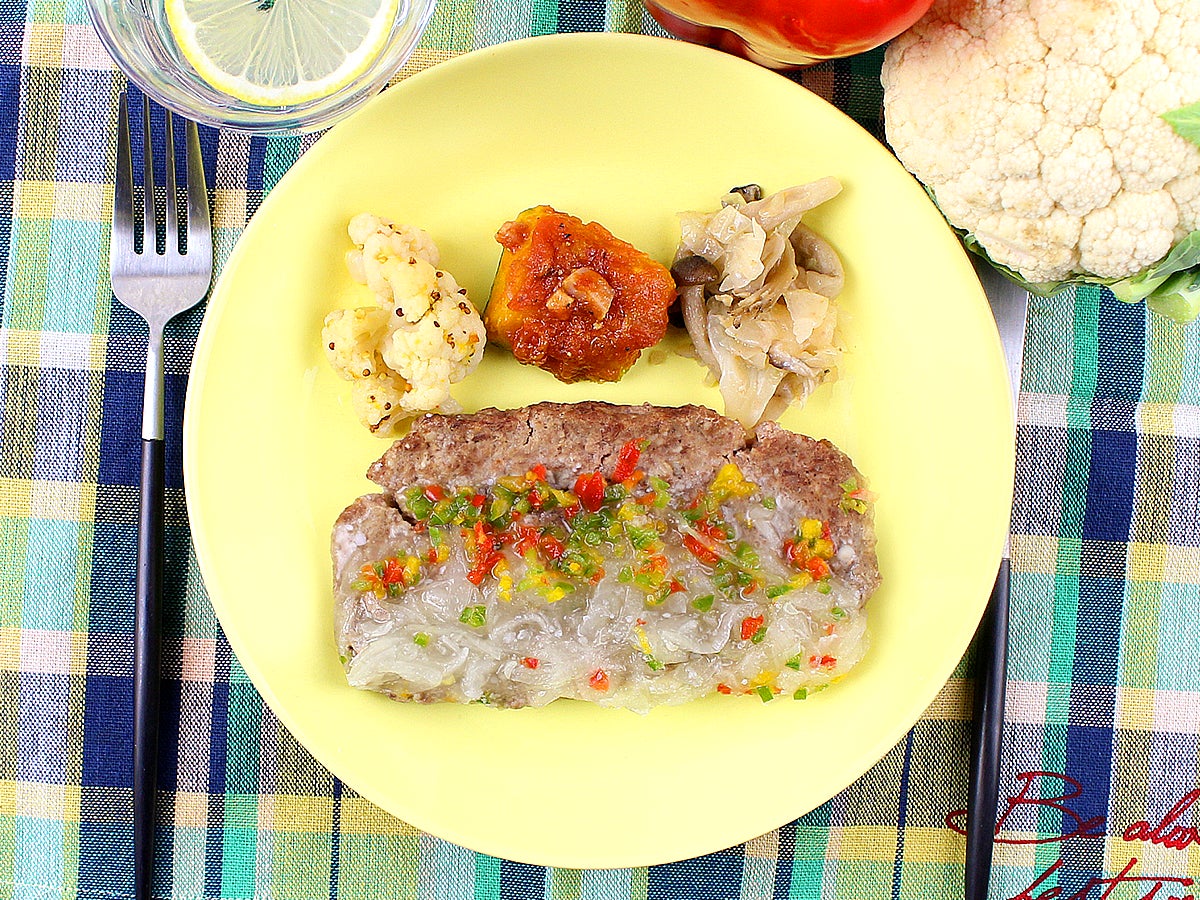 食べ応えのある牛パティステーキを、あっさりとコンソメ煮でご用意しました。噛めば旨味があふれる牛肉らしい食感は残しつつ、全体はやわらかく仕上げました。甘味のある玉ねぎスライスが下に敷いてあります。肉の旨味が出たスープも最後までお召し上がりください。副菜は、酸味と旨味のあるカリフラワーの粒マスタード、ほっくりしたカボチャのトマトソース、きのことキャベツのオニオンマリネです。