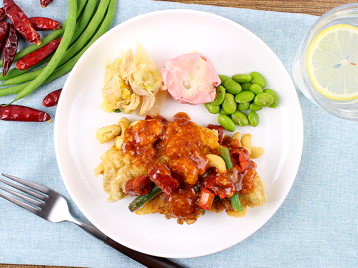 鶏モモ肉のから揚げを、唐辛子とカシューナッツを合わせた辛味ソースでガツンと濃いめの味で仕上げました。麻辣醤と山椒たれを合わせた刺激的な辛さになっております。唐辛子も食べられますのでパリパリ食感をお楽しみください。副菜は、白菜と鶏肉の葱生姜だれ、海老と白身魚をきれいな桜色の皮で包んださくら焼売、枝豆と搾菜のあえものです。辛い主菜に合わせてあっさりめで揃えております。