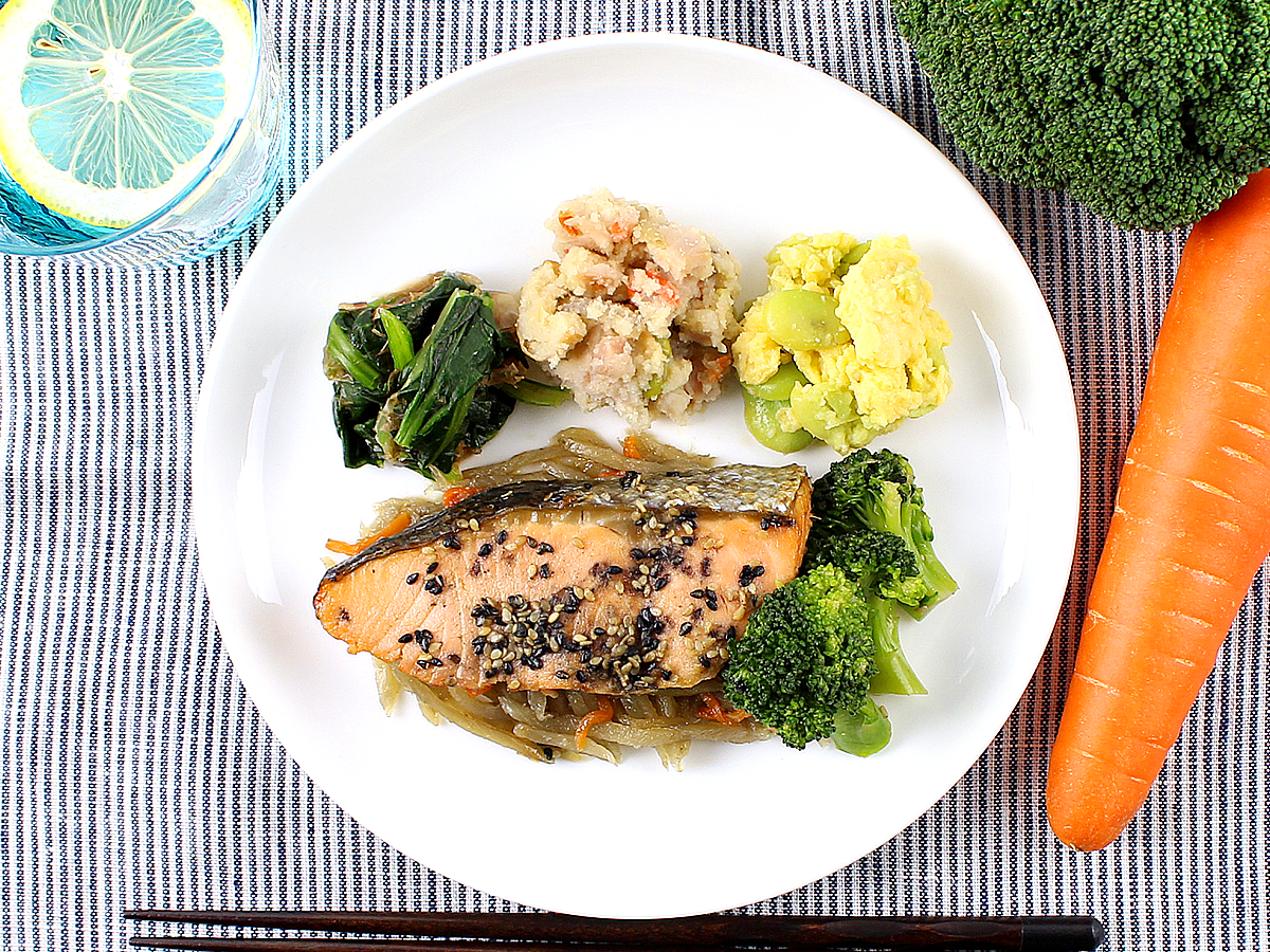 ロングセラーの鮭料理プレートをリニューアルしました。シンプルな塩味とごまの香ばしさが感じられる素朴な一品です。黒ごまと白ごまの2種類を使用して、ごまの風味がより強くなるようにしました。優しい味のきんぴらごぼうを鮭の下に敷き、食べやすく飽きのない味に仕上げております。副菜は、小松菜のおひたし、卯の花、そら豆と炒り卵です。全体的にあっさりとした味わいのセットですので、朝食にご利用いただくのもオススメです。