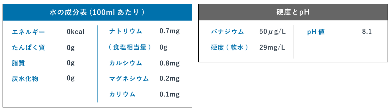 「朝霧のしずく」は、富⼠⼭の雄⼤な⾃然のフィルターによって、⻑い時間をかけて磨き上げられた天然⽔。注⽬のミネラル成分「バナジウム」をはじめ、天然ミネラル成分がバランスよく溶け込んでいます。