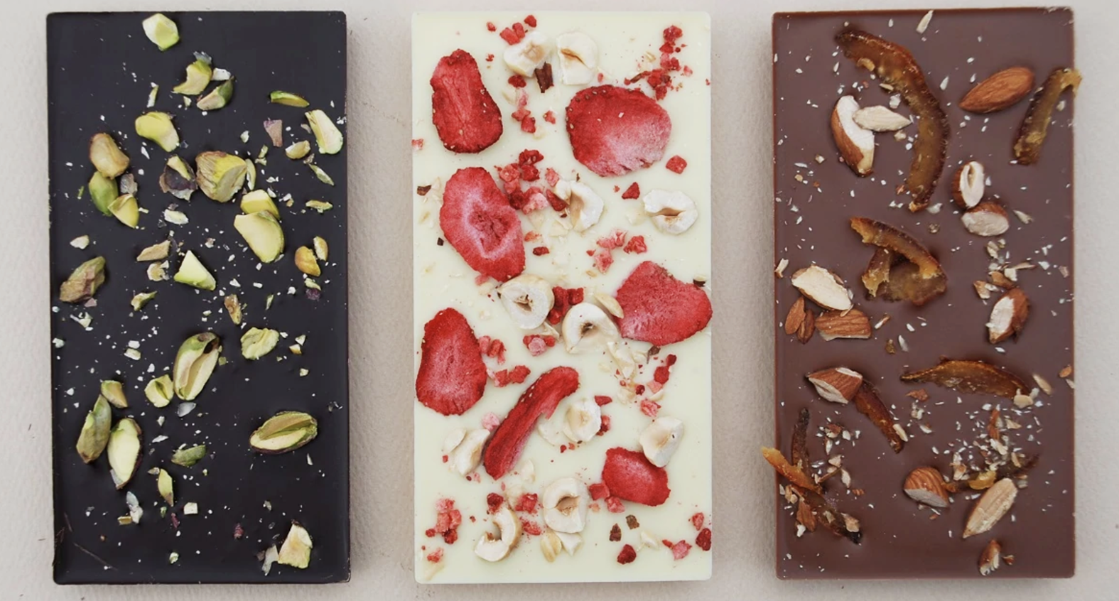 愛媛県産のフルーツや、世界各国から輸入された上質なナッツ等を使用した板チョコレート。「ミルクアーモンド&いよかん」、「ミルクいちじく」など全6種。