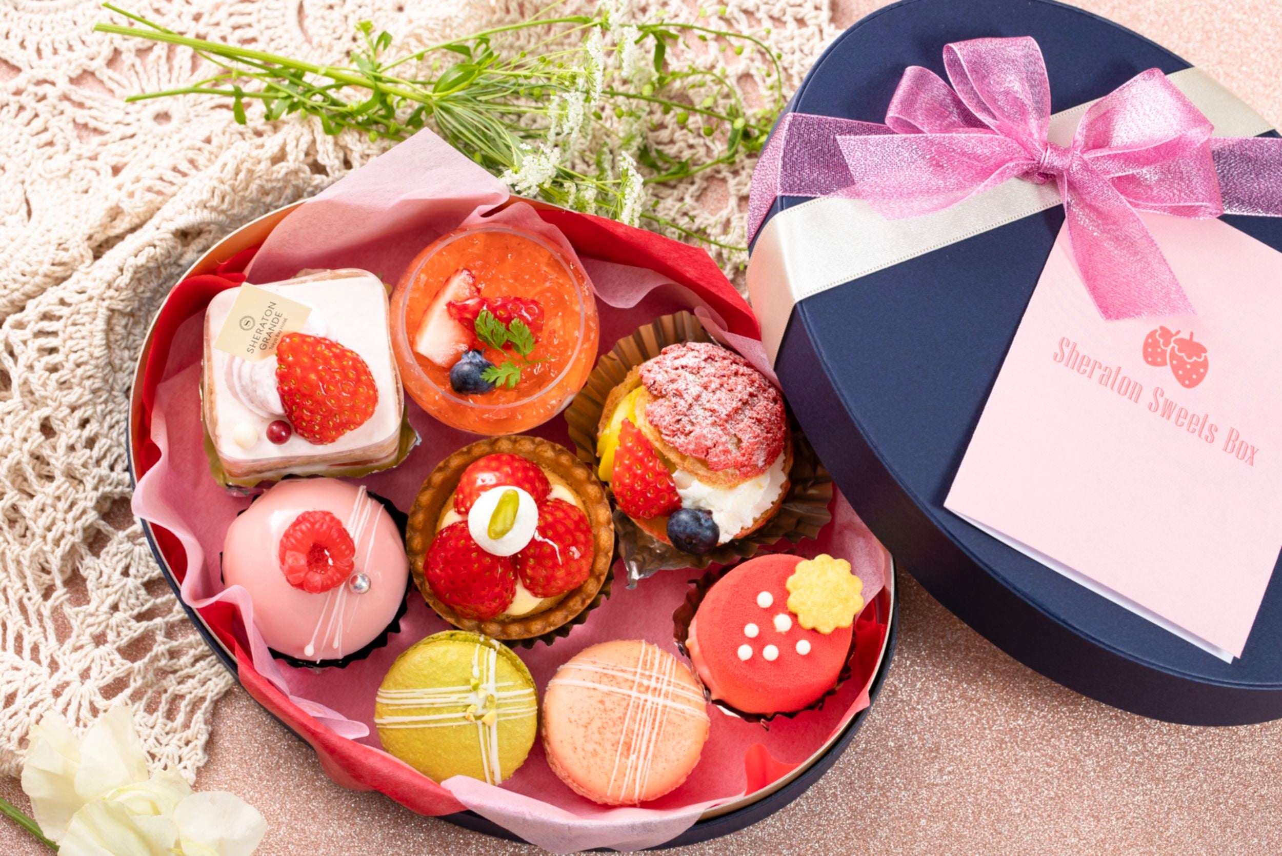 毎月好評の8種類のミニスイーツを宝石箱のように閉じ込めた「#シェラトンスイーツボックス」。今回は、スイーツを真っ赤なジュエリーに見立てた、いちご尽くしのボックスに仕上げています。シェフ選りすぐりのミニスイーツの数々をぜひお楽しみください。