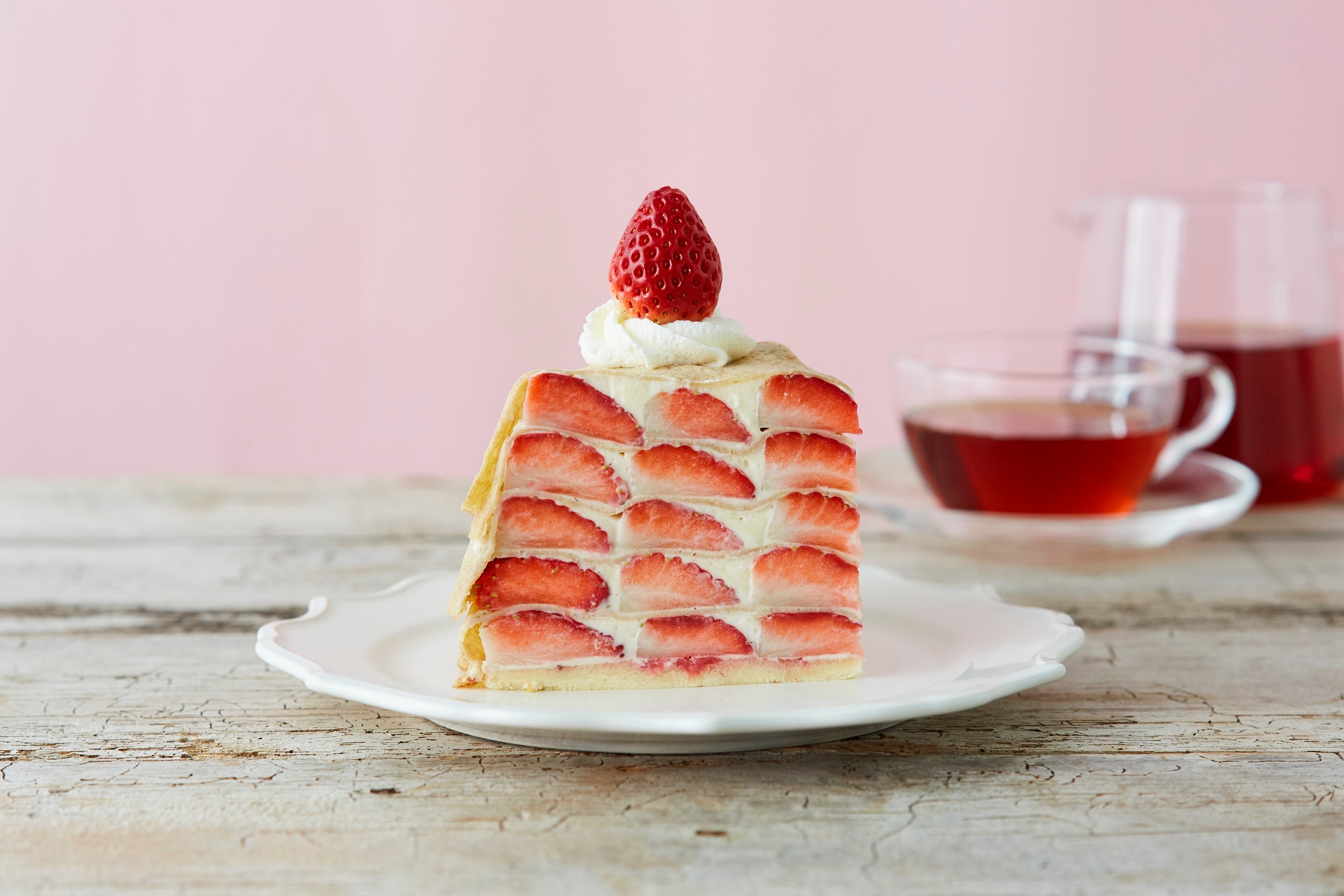 「いちごさん」を贅沢に使用し、ディプロマットクリーム、もちもち食感のクレープで5層にサンド。まるごと一粒「いちごさん」をトッピングしました。
