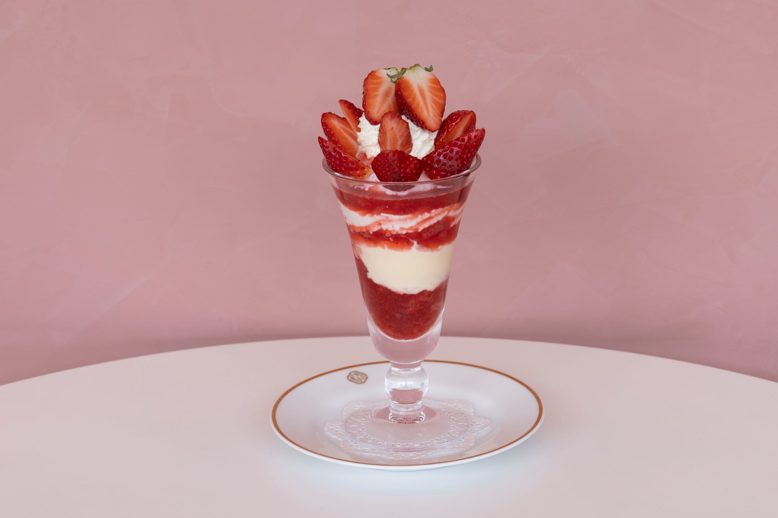 みずみずしい甘みと酸味、食感を活かした「いちごさん」を存分に味わえる資生堂パーラー王道のストロベリーパフェ。いちごの美しい断面も愛でながら楽しんでください。