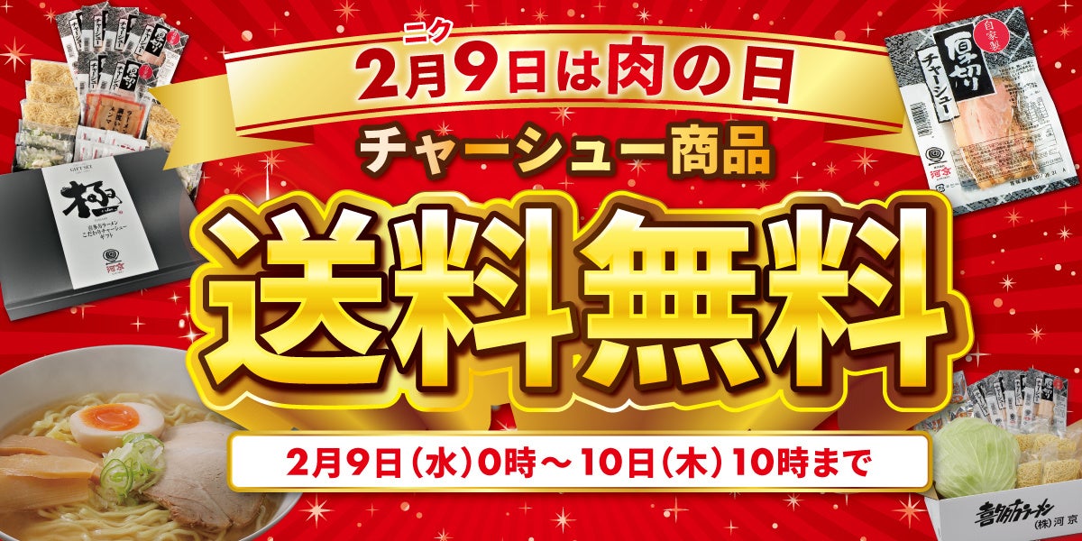 『肉の日』に良い肉を味わっていただきたいという想いから、肉の日にちなみ2月9日0時~2月10日10時まで、チャーシュー商品送料無料キャンペーンを開催いたします。