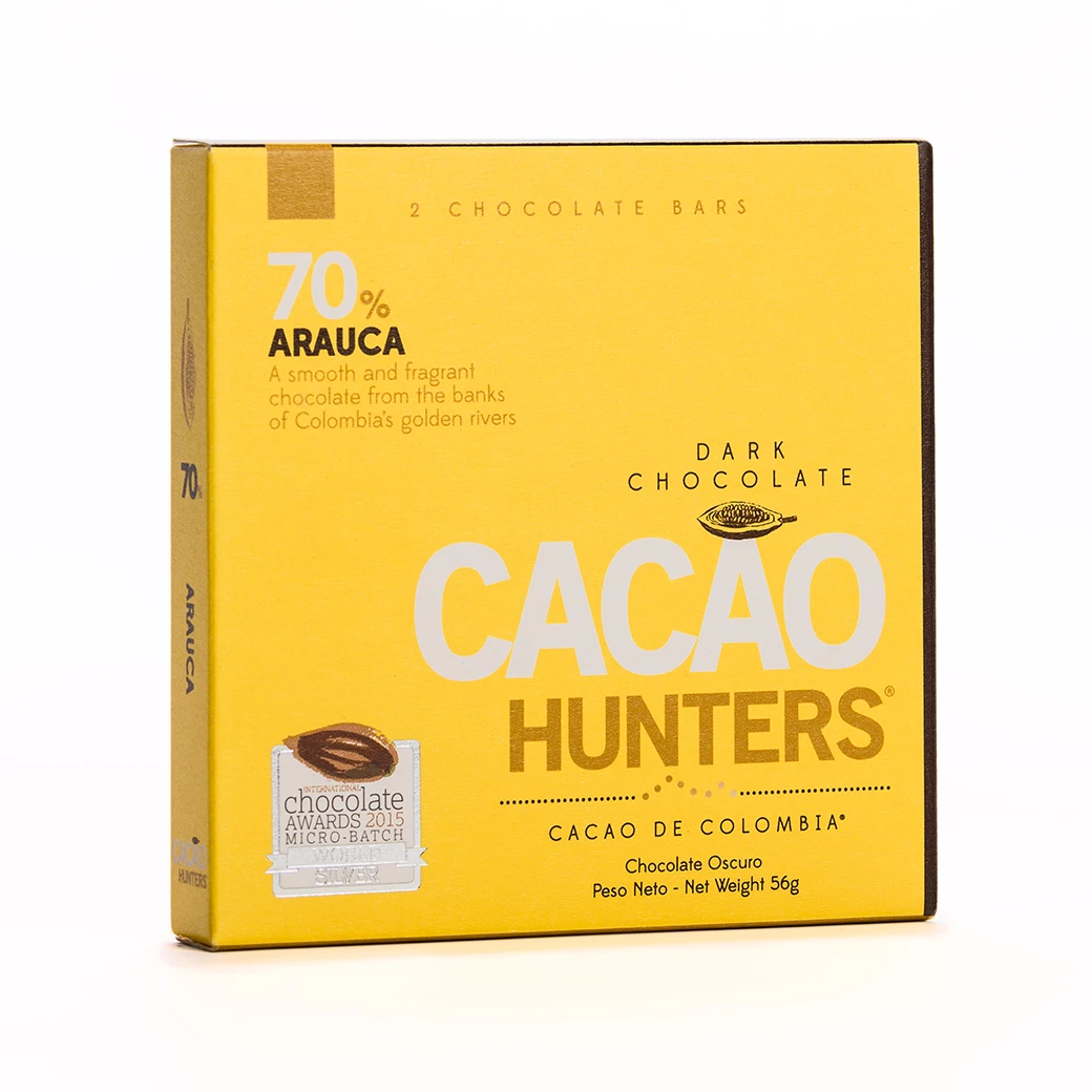 CACAO HUNTERS®は世界15カ国のカカオ原産国を旅してきた小方真弓氏とコーヒーの世界に従事するカルロス・ベラスコ氏が2013年にコロンビアで立ち上げた。良質カカオの産地南米コロンビアで、カカオの調査や栽培の指導、チョコレートの製造まで行う。2020年には初店舗をJR東京駅グランスタ内にOPEN。ICA初出店の2015年~2021年にかけて世界大会にて金賞他、数多くの賞を受賞している。
