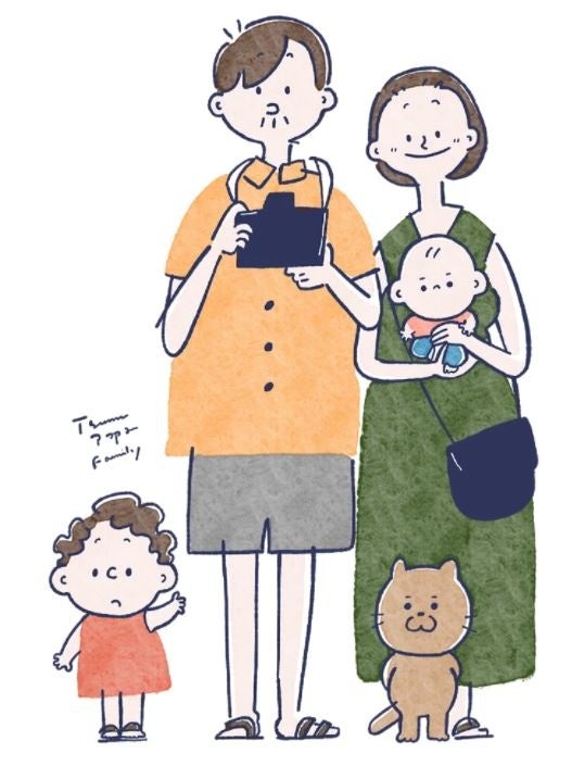 パンが大好きな「つむぎちゃん」、車と電車が大好き「なおくん」、「つむまま」、そして猫の「はじめ」と一緒に暮らしている「つむぱぱ」。つむぱぱは、家族との何気ない日常をInstagramでほっこりとしたイラストで表現し子育て世代を中心に幅広い人気を誇るインスタグラマー。好きなものは古い家具とDIYで、自宅の家具やつむぎちゃんのおもちゃを作ることも。フォロワー約73万人を持つ、つむぱぱInstagramはこちら: @tsumugitopan
