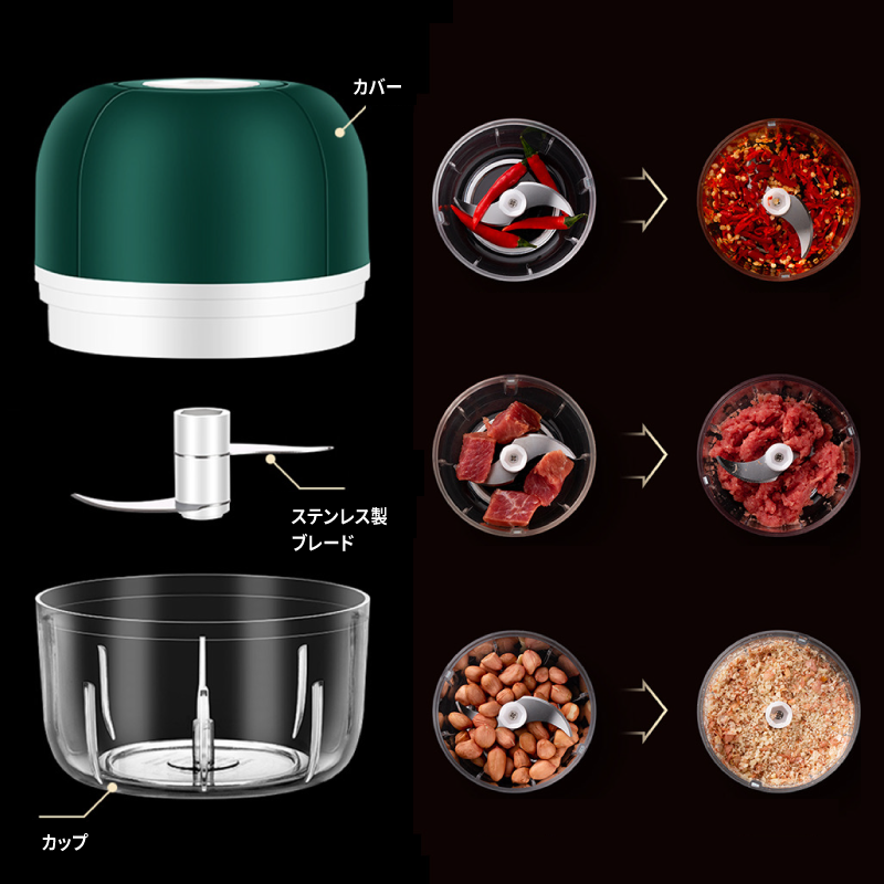 野菜のみじん切り、肉や魚のミンチ、ナッツを細かく砕けるるので、食材に合わせて刃を変える必要がないのでサッと使えます。 コンパクトサイズなので収納場所も取りません。 カップと刃は全て丸洗いできてお手入れも簡単です。 用途に合わせて、フードプロセッサーのサイズを選べるように、100mlと250mlの2パータンのセットでご用意しております。