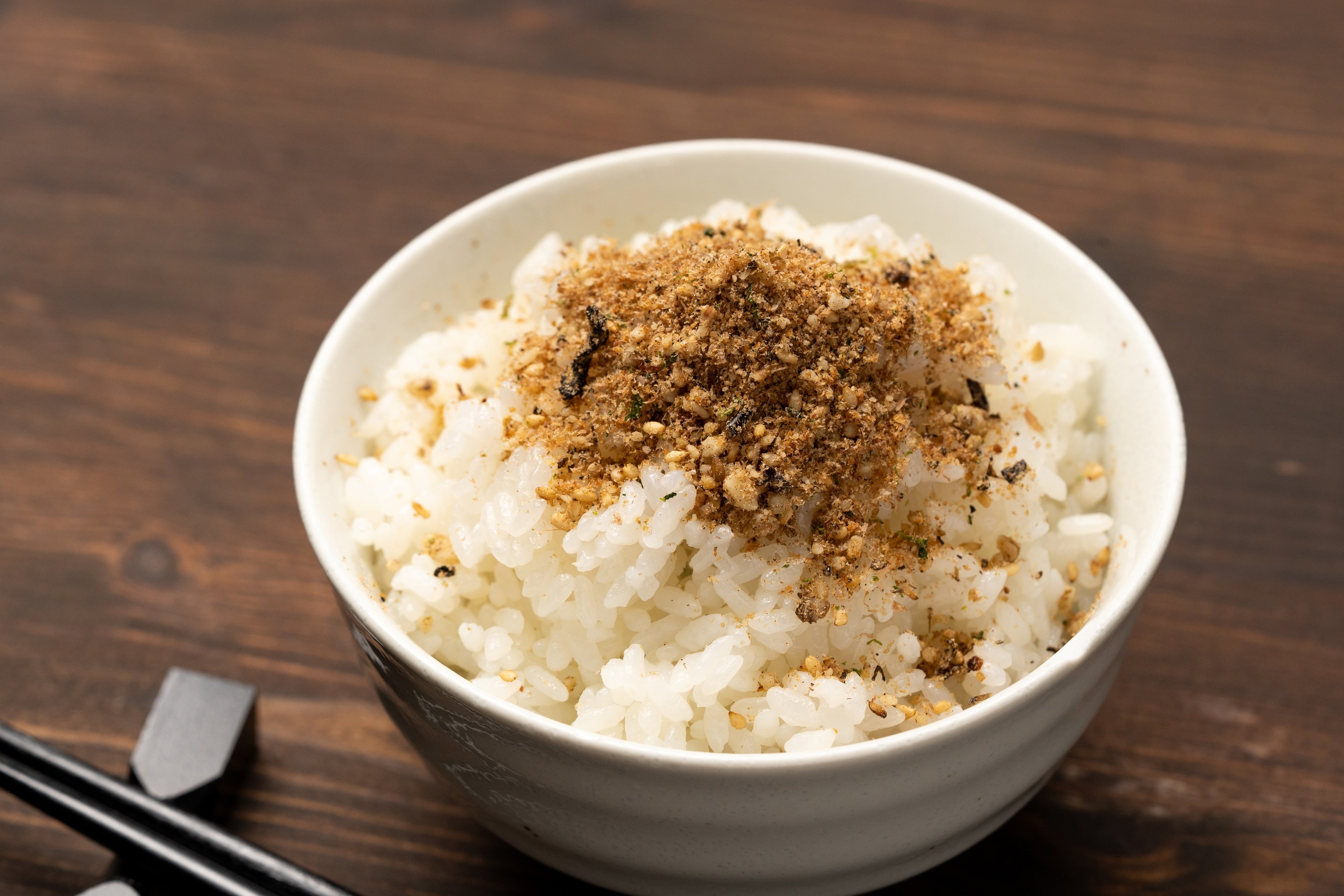ざざむしの目線に立ち、ふりかけの中にざざむしが棲む環境を表現しました。ざざむしは川の中の石に隠れ、石についた苔などを食べて生活しています。粗挽きのくるみはそんな石を、川のりは苔を表現しています。
