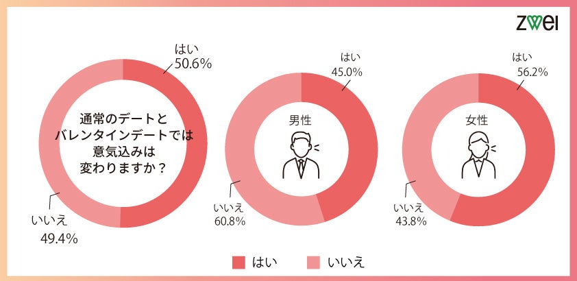 やはり思いを伝える側の女性の方が、男性よりもバレンタインデートを意識して意気込みが増すようだ。