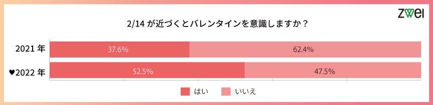 「バレンタインを意識する」と答えた男性が、昨年の「37.6%」から今年は「52.5%」まで増加した。