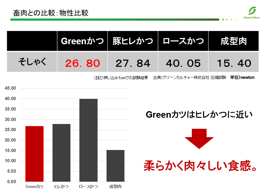 本製品の開発にあたり、「植物性とんかつ」と畜肉を使用した「かつ」との比較試験を実施いたしました。圧縮試験の結果、豚ヒレかつと近い食感を得ることに成功いたしました。また、他にも下記のような研究成果を得ることができました。