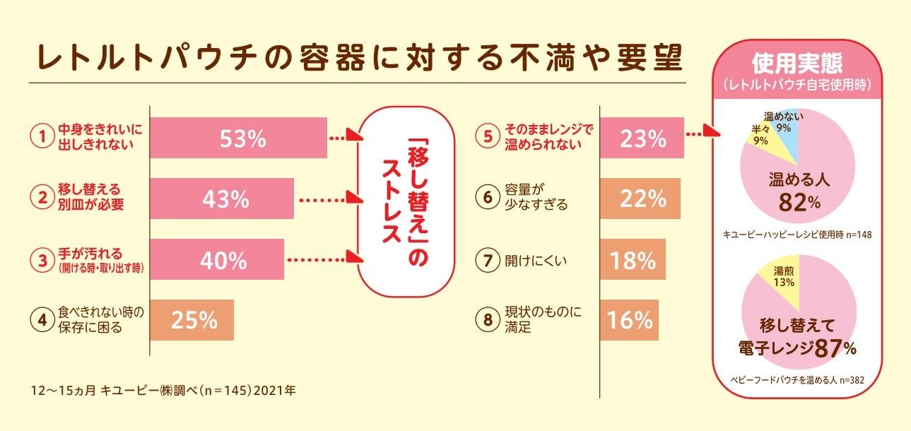 キユーピー株式会社(本社:東京都渋谷区、代表取締役 社長執行役員:長南 収、以下キユーピー)は、ベビーフードの新シリーズ「レンジでチンするハッピーレシピ」を全14品で新発売します。本シリーズは、電子レンジで加熱可能なパウチを採用した国内初のベビーフードです。従来のレトルトパウチに4割以上の人が感じている「移し替え」のストレス(キユーピー調べ、【参考データ】参照)を解消し、移し替えずに食べさせることができます。準備・片付けが手早くできることで、赤ちゃんと食事を楽しむ時間や食後の触れ合う時間の創出につなげます。