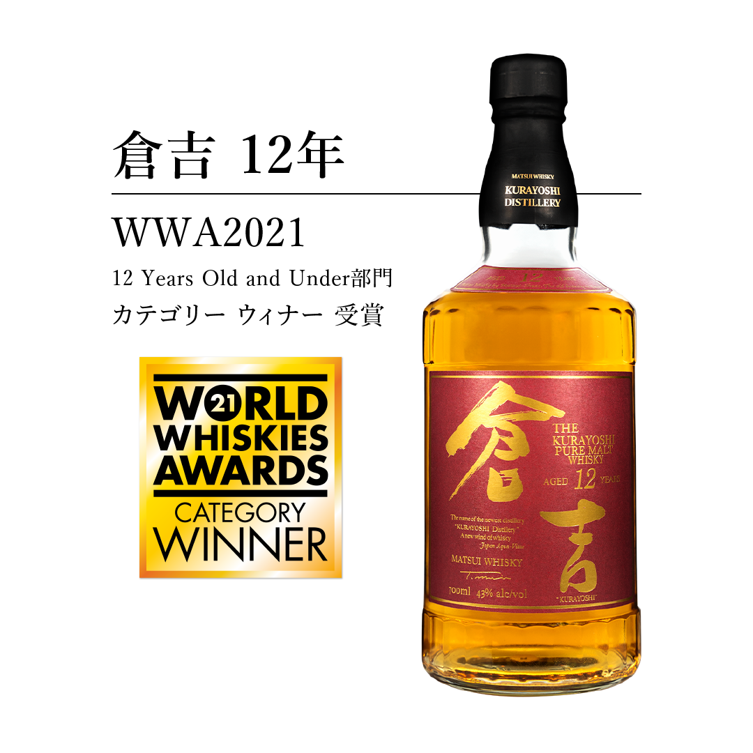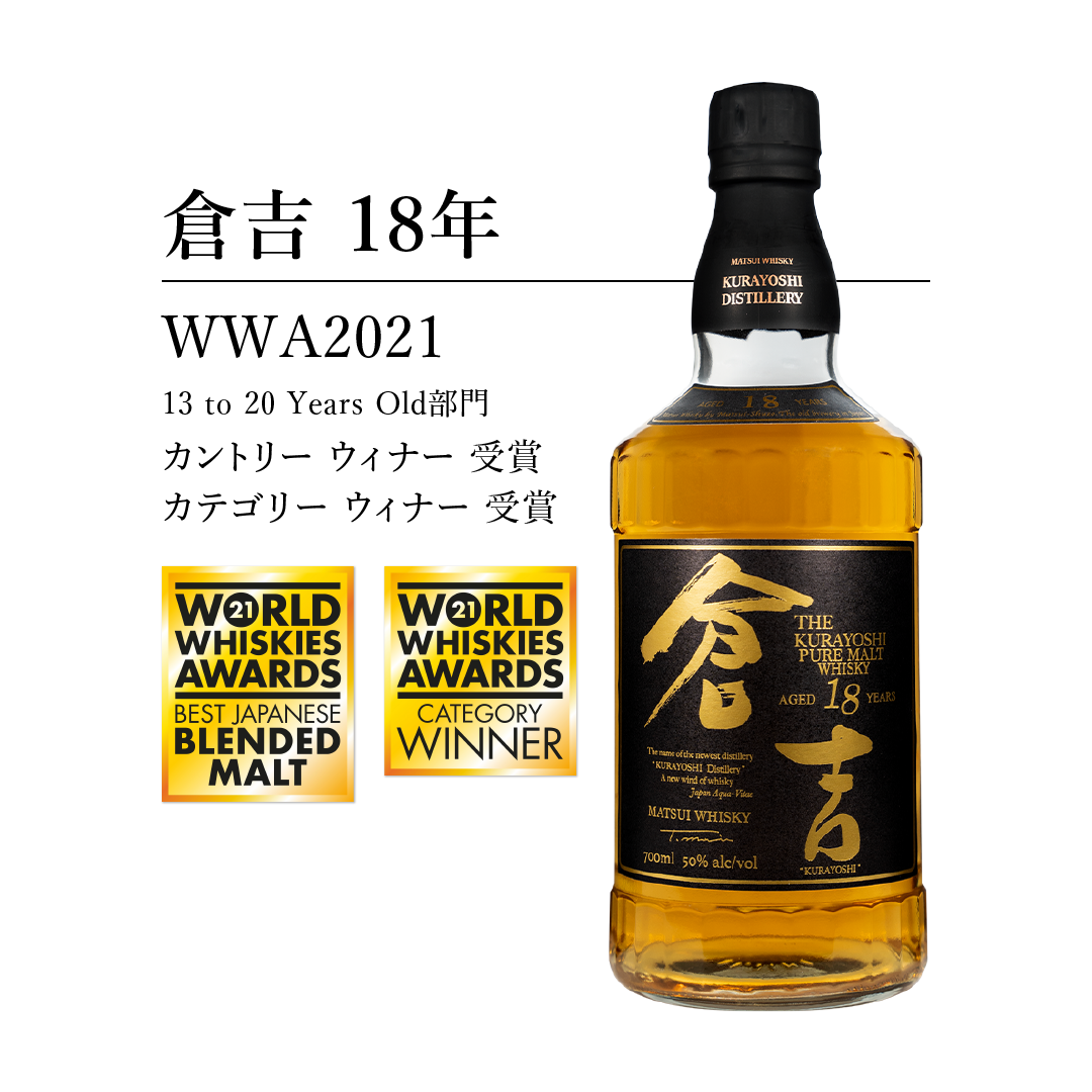 松井酒造合名会社 (以下、倉吉蒸溜所 所在地:鳥取県倉吉市)は、世界的に権威のあるウイスキー品評会World Whiskies Awards 2021(以下WWA)において、マツイピュアモルト「倉吉18年」がカントリーウィナー(最高賞)、カテゴリーウィナー(最高賞)のダブル受賞を筆頭に以下の賞を受賞いたしました。
