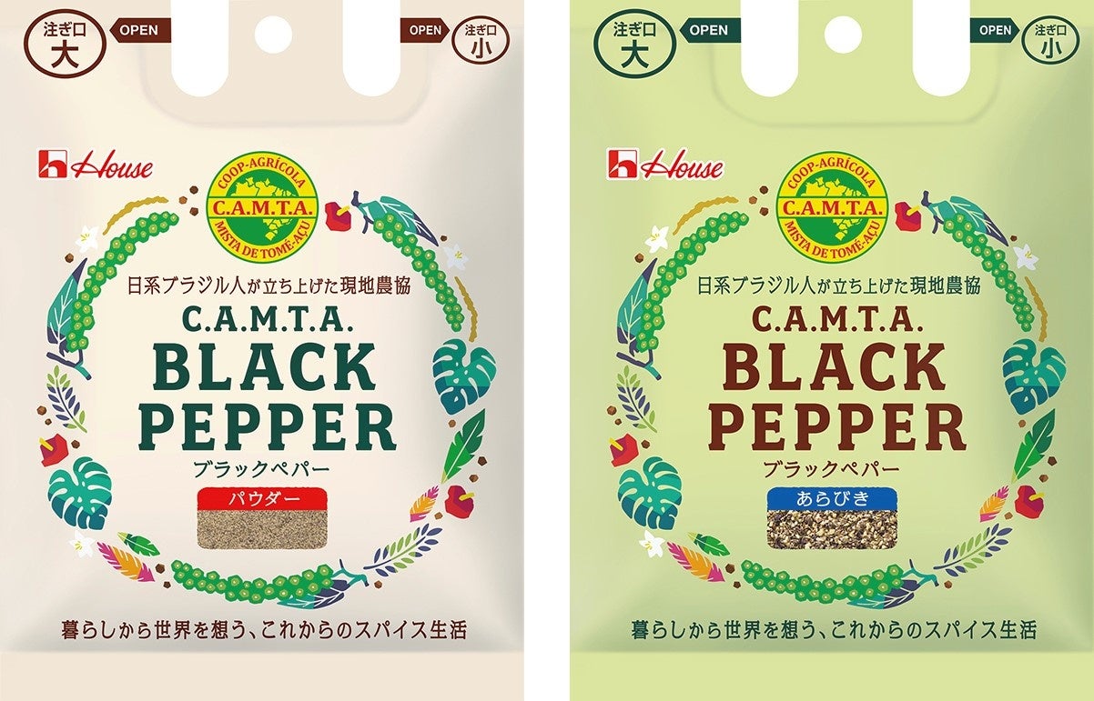 ハウス食品は、製品の購入を通じて産地の生活応援に繋がるスパイス製品「C.A.M.T.A.BLACK PEPPER(カンタ ブラックペパー)」を、2月14日からスーパーなどで発売します。ブラジル トメアス地区で日系ブラジル人が立ち上げた現地農協(C.A.M.T.A.)の組合員が栽培した“穏やかな香りとシャープな辛味”が特徴の黒胡椒を、“パウダータイプ”と“あらびきタイプ”の2種類で展開します。税別希望小売価格200円。