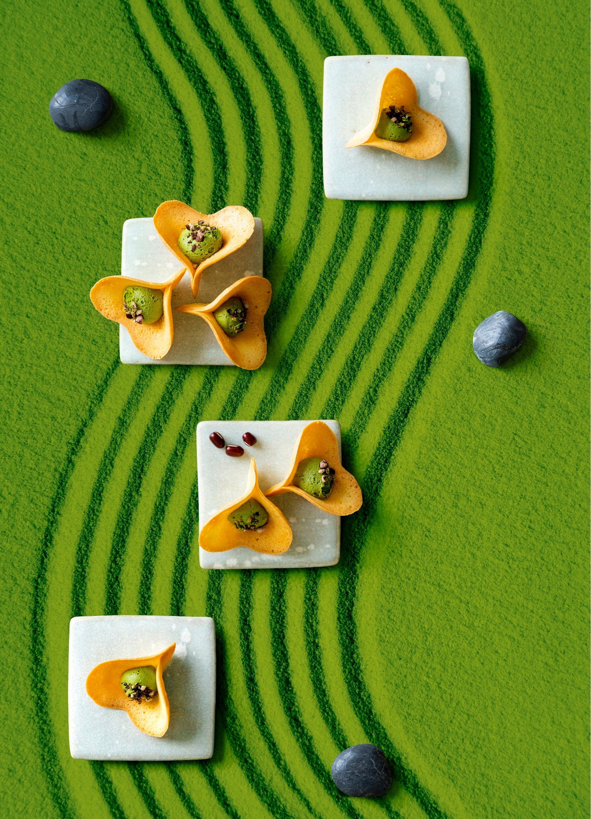 米油を使用したしっとりフワフワのシフォン生地と、濃厚なソース、アクセントを加える食感のトッピングのハーモニーをお楽しみください。