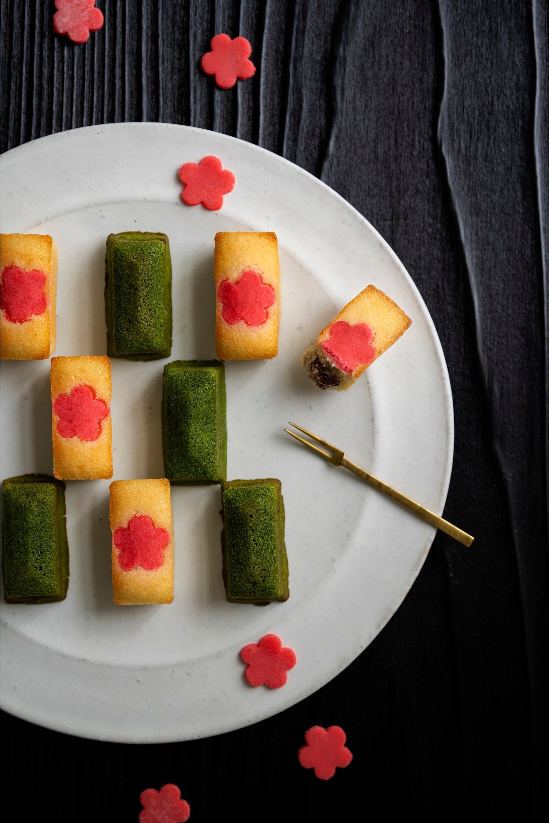 バターをたっぷり使用したしっとり一口サイズのフィナンシェに、京菓子處鼓月で使用する大納言小豆餡を入れました。プレーンの表面には上生菓子で使用される「こなし」で季節の柄をあしらいました。