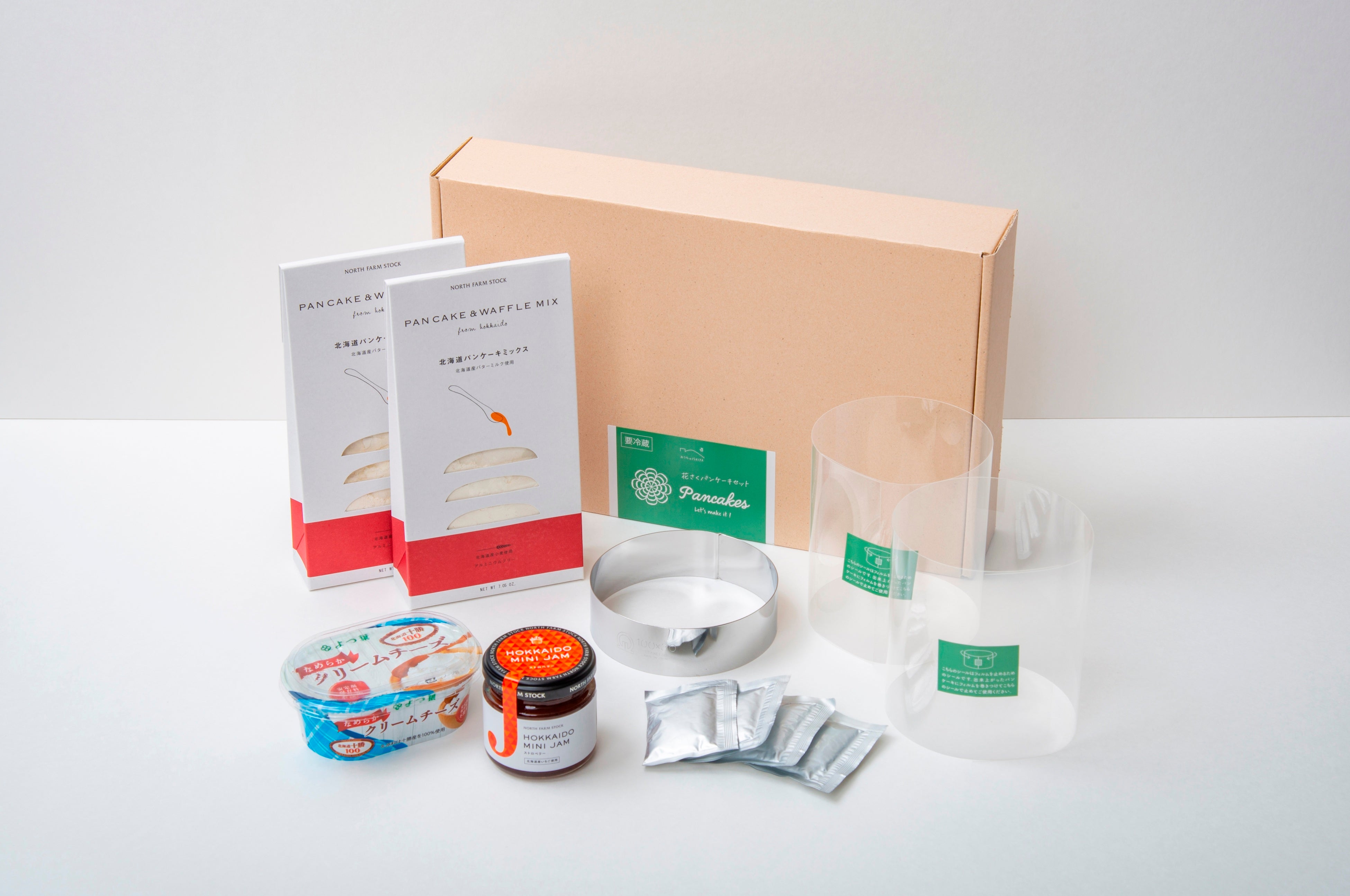 ■商品内容:北海道パンケーキミックス(2食分)×2(NORTH FARM STOCK製)、クリームチーズ×1個(よつ葉 製)、ストロベリージャム×1個(NORTH FARM STOCK製)、フランボワーズソース×4個、ステンレスセルクル×1個、透明フィルム×2枚、フィルム留めシール4枚