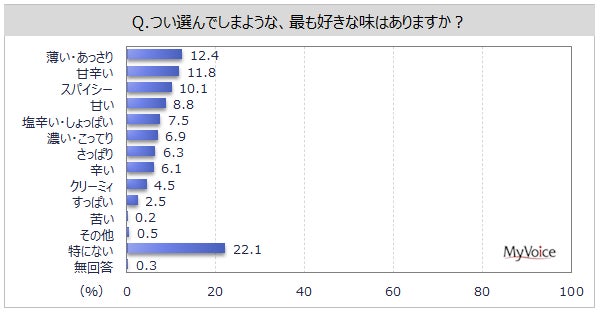■つい選んでしまうような、最も好きな味は「薄い・あっさり」「甘辛い」が各1割強