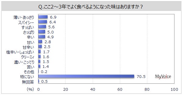 ここ2~3年で食べるようになった味がある人は3割弱です。食べるようになった味は(複数回答)、「薄い・あっさり」「スパイシー」「すっぱい」が6~7%です。女性10・20代では、「辛い」がやや高くなっています。