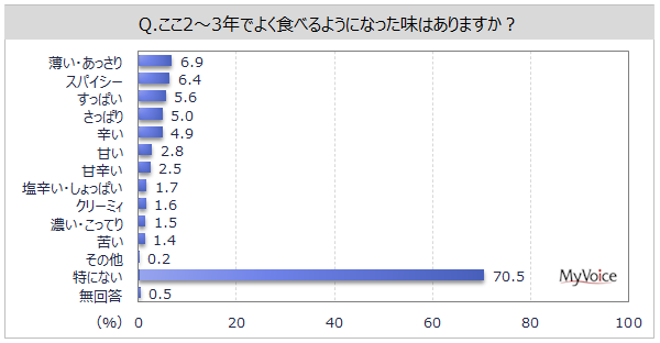 ここ2~3年で食べるようになった味がある人は3割弱です。食べるようになった味は(複数回答)、「薄い・あっさり」「スパイシー」「すっぱい」が6~7%です。女性10・20代では、「辛い」がやや高くなっています。